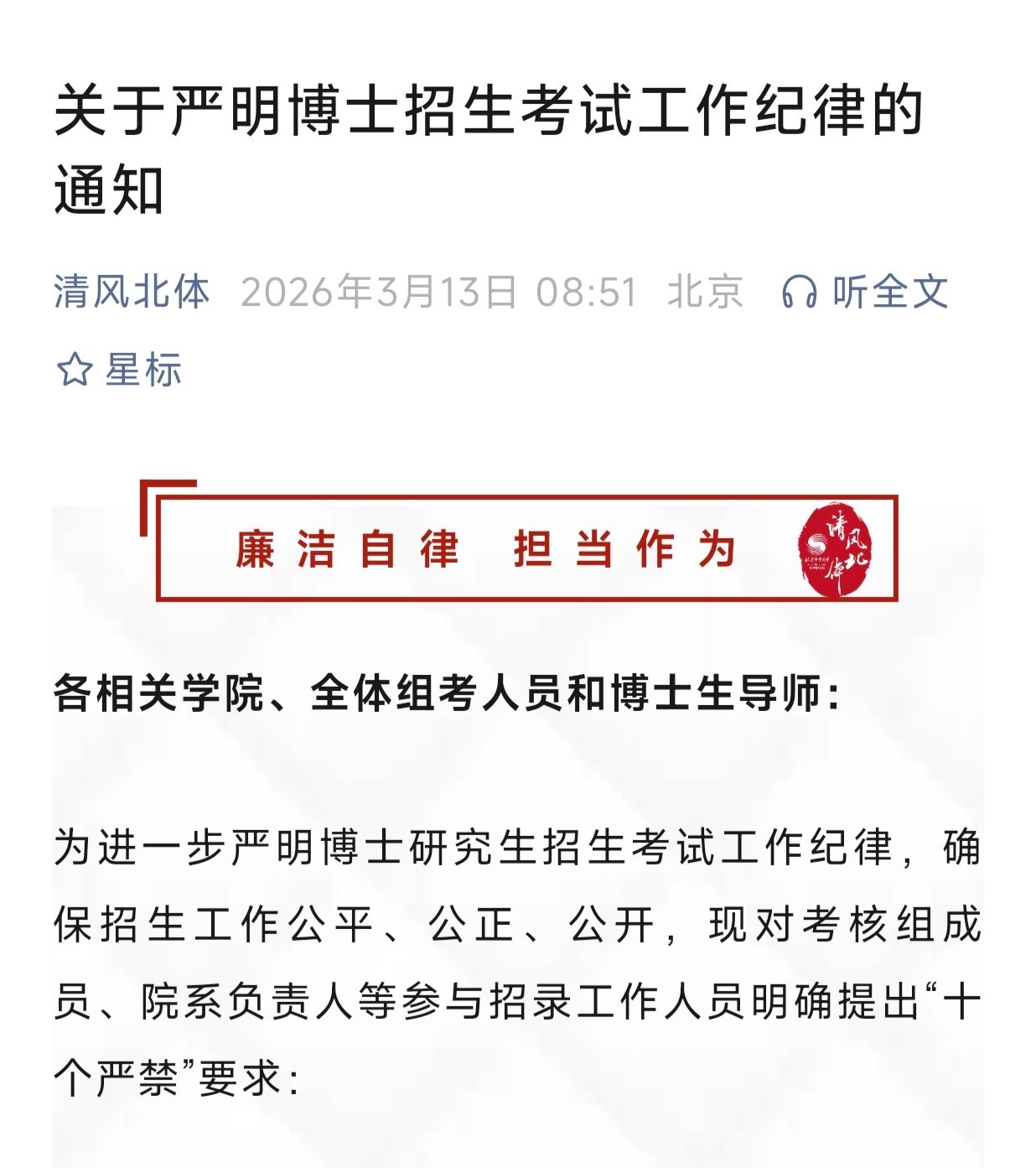 3月13日,“清风北体”发布“关于严明博士招生考试工作纪律的通知”。