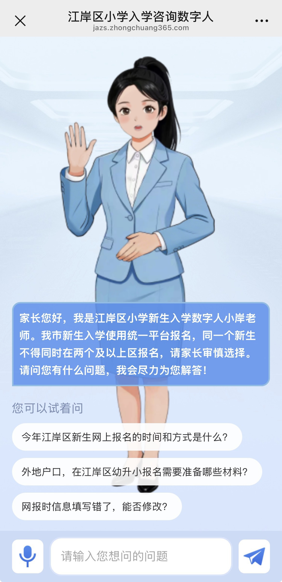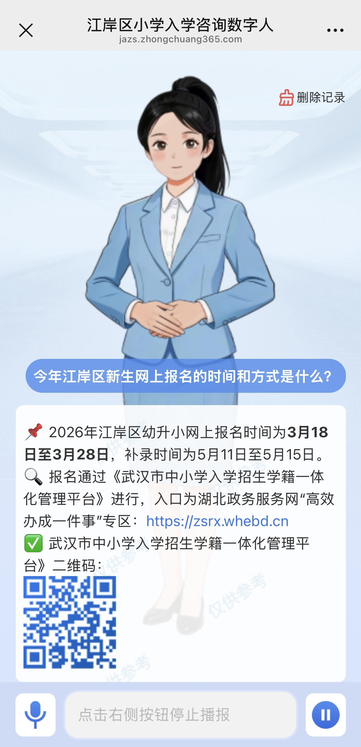 3月17日,在武汉市2026年义务教育阶段新生入学招生工作通知发布后的第二天,江岸区教育局正式上线武汉市首个专门服务小学新生入学咨询的AI数字人“小岸老师”。家长从“江岸教育”微信公众号的教育服务板块,可以直接进入“入学咨询数字人”页面,语音或文字输入问题后,约3秒即可获得基于政策的回应。