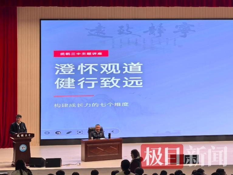 3月19日下午,武汉市武钢三中报告厅内掌声阵阵,一场别开生面的理想信念与法制教育课在这里开讲。主讲人是武汉市公安局青山分局副局长沈彤,他以《澄怀观道 健行致远》为题,带来了一场既有哲学思辨高度、又充满法治警示温度的讲座,与正值青春的高中生们进行了一场关于“因果与学习、敬畏与成长”的深度对话。会议由武钢三中党委书记张文献主持。