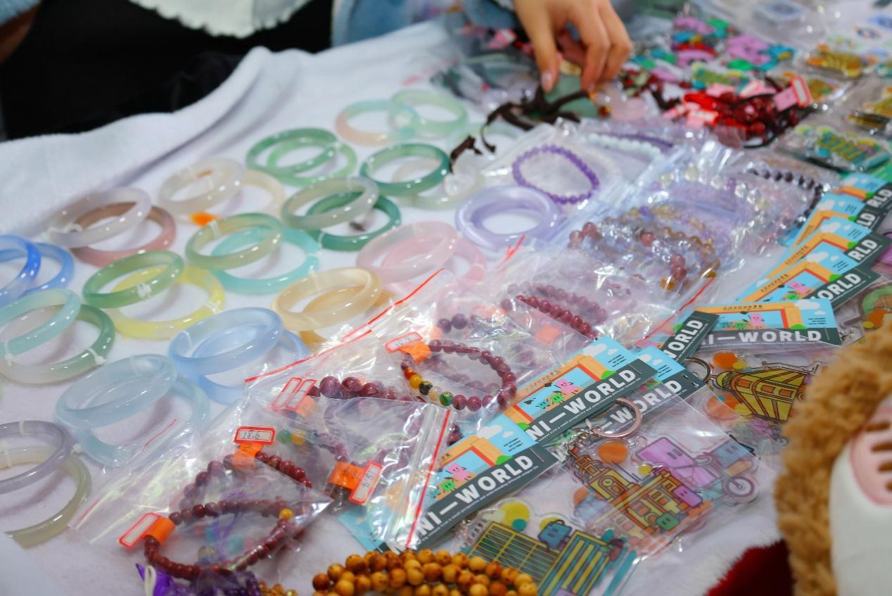 “我从上学期便开始筹备这次展览,从草图构思、风格统一,到校园建筑采样调研与数据分析,一步步将作品落地完成。”3月18日,在武汉工程科技学院第三届文创潮玩周活动现场,2023级视觉传达设计专业学生叶子慧正与驻足观赏的同学分享自己的创作故事。她的摊位上,带有学校建筑插画的明信片依次排开,温润的玉髓手镯在灯光下泛着柔和光泽。“我结合自己的画风与兴趣选定主题,希望传递对校园的独特感受,也期待作品能得到大家的认可与喜爱。”