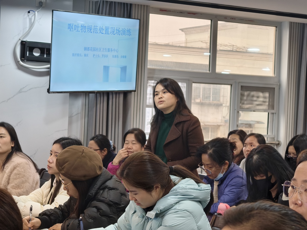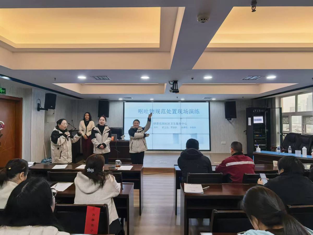 钢都花园社区卫生服务中心专业团队聚焦校园高发的诺如病毒呕吐物处置,开展沉浸式实操演练。演练模拟校园内突发学生呕吐场景,专业人员逐一进行精准操作示范,细致讲解个人防护装备穿戴、含氯消毒液科学配比、污染区域划定、呕吐物规范清理、环境全面消杀等关键步骤,强调每一个环节的标准化操作要求。
