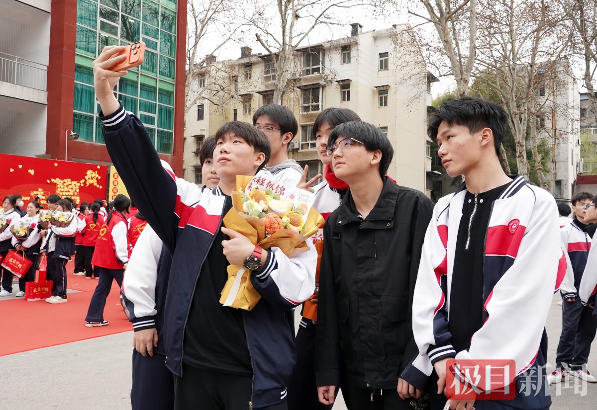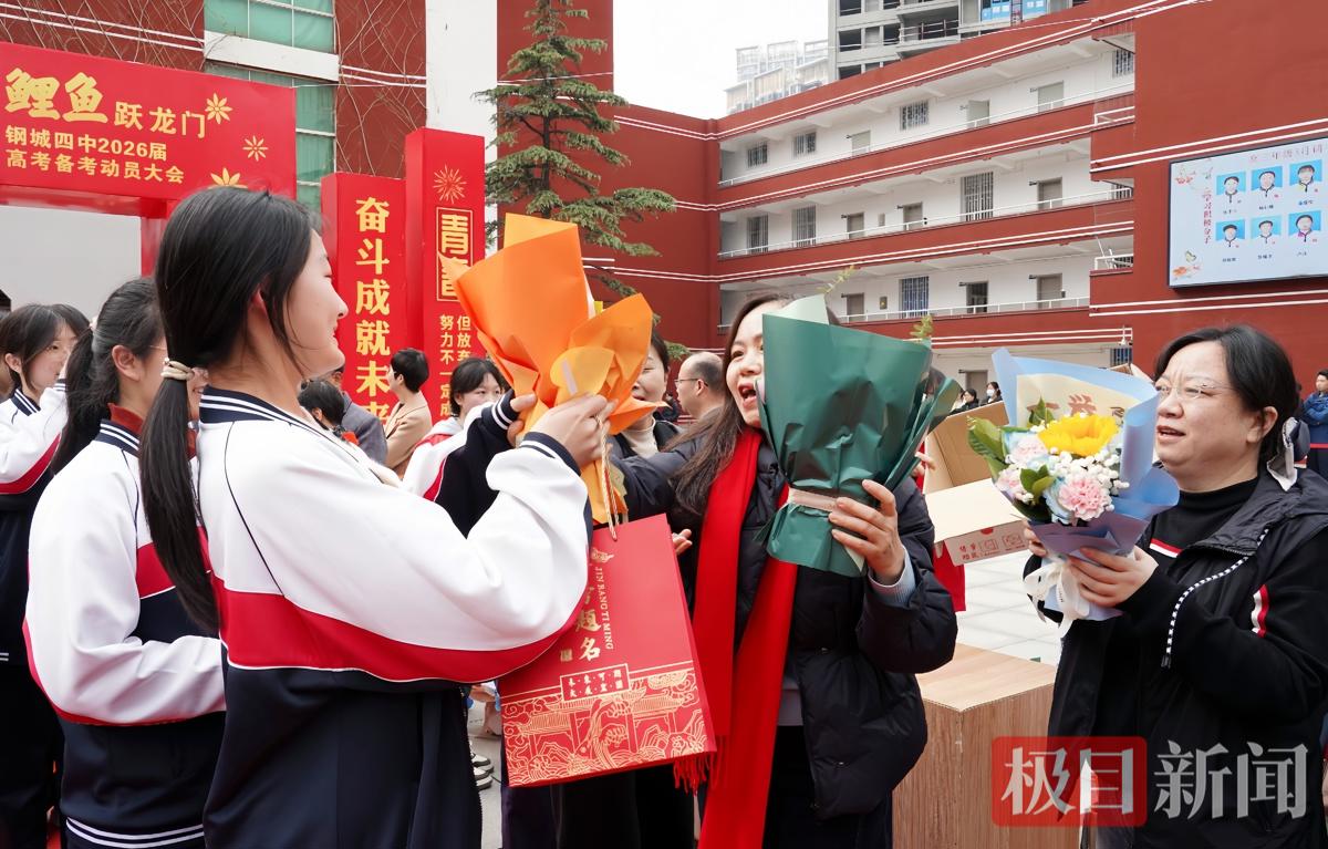 门的另一侧,班主任和任课老师手持鲜花和“加油大礼包”,逐一递到学生手中。每递出一份礼物,老师们都会附上一句专属祝福——“青春无悔”“你很棒”“这段日子,值得铭记”。家长们也踮起脚尖,挥舞手臂,在人群中寻找自己的孩子。