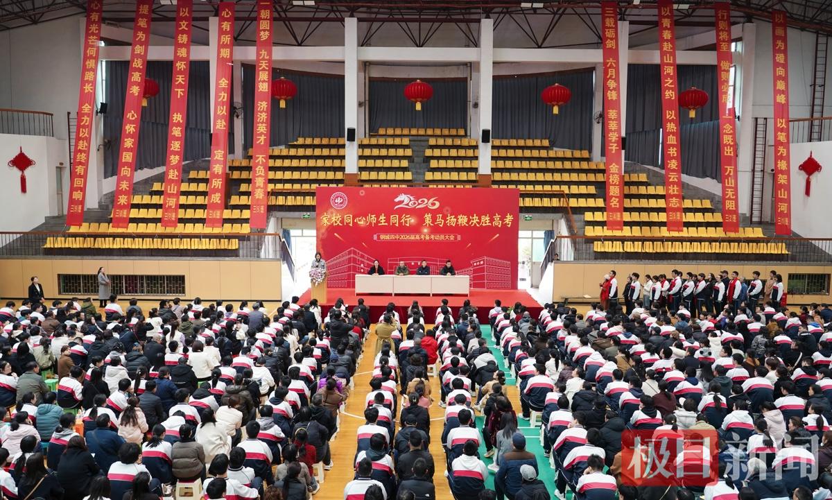 一个月前,林宇浩不慎摔倒,导致腿部骨折。医生建议他居家休养,但他坚持拄拐返校。“还有80天就高考了,我想和同学们一起走完这段路。”他说。当天,学校举行2026届高考备考动员大会,主题为“家校同心师生同行 策马扬鞭决胜高考”。林宇浩不想缺席这场属于他们的青春仪式。