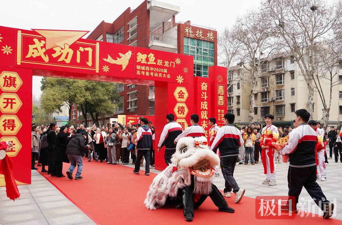 集中会议结束后,体育馆外响起激昂的鼓点。学校舞蹈社和高二部分学生代表组成的舞狮队和腰鼓队,在“成功门”两侧列队迎候。红绸飞舞,鼓声震天,一头“狮子”摇头摆尾,时而跳跃,时而驻足,为即将迈入这道门的学长学姐们送上热烈的祝福。
