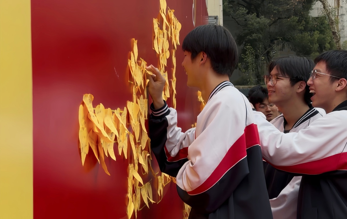 不远处,高三(9)班学生郭佳滕和母亲并肩站在“心愿墙”前合影。墙上贴满了彩色便利贴,学生们在上面写下心愿与誓言。“不负青春”“做最好的自己”“谢谢这三年”……字迹或工整或潦草,都是青春的印记。“这是属于我们的青春纪念册。”郭佳滕指着自己刚贴上的便利贴说。