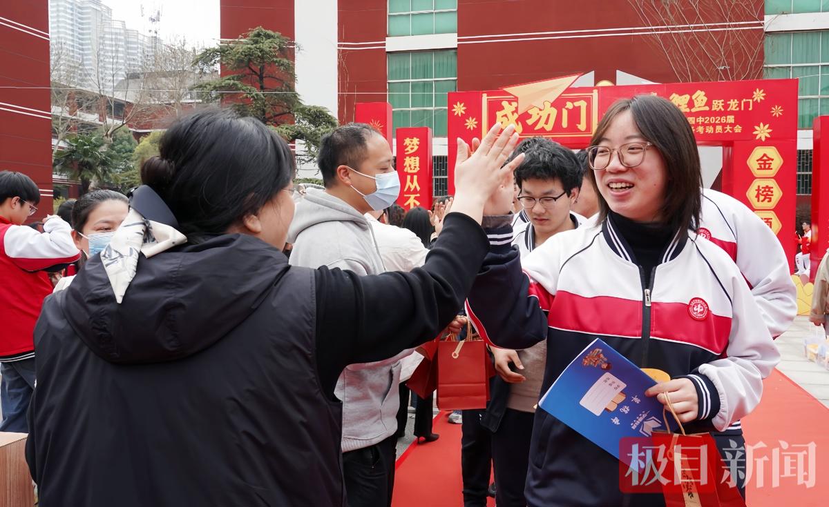“妈妈!”高三(8)班学生刘媛慧刚跨过“成功门”,一眼就看见了等候多时的母亲。母女俩紧紧相拥,母亲轻轻拍着女儿的背:“不管走到哪里,你永远是我们最爱的女儿。”刘媛慧是当天的学生领誓人,还参与了歌曲《我相信》的快闪演唱。“站在台上,看着台下一起奋斗了三年的同学,我突然意识到,这段并肩走过的日子,本身就是青春最好的礼物。”她说。