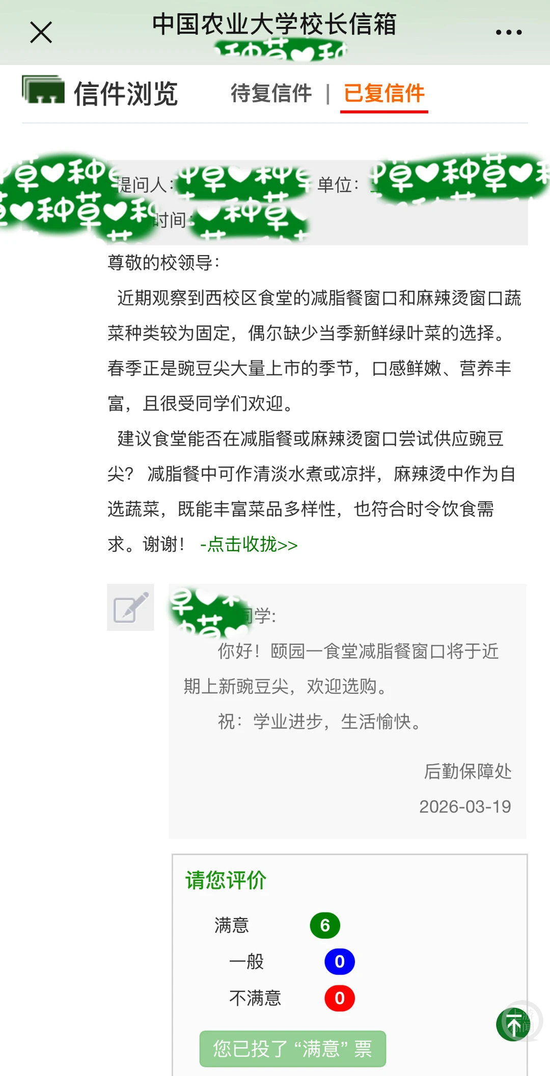 发帖晒出的邮件截图显示,有学生在校长信箱中写道:“近期观察到西校区食堂的减脂餐窗口和麻辣烫窗口蔬菜种类较为固定,偶尔缺少当季新鲜绿叶菜的选择。春季正是豌豆尖大量上市的季节,口感鲜嫩、营养丰富,且很受同学们欢迎。”该学生建议:“食堂能否在减脂餐或麻辣烫窗口尝试供应豌豆尖?减脂餐中可清淡水煮或凉拌,麻辣烫中也可作为自选蔬菜,既能丰富菜品多样性,也符合时令饮食需求。”3月19日,后勤保障处回信称,颐园一食堂减脂餐窗口将于近期上新豌豆尖,欢迎选购。
