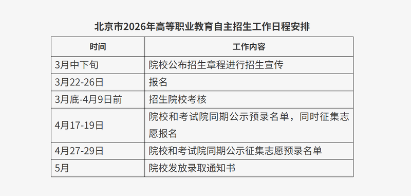 北京市2026年高职自主招生日程安排。图/北京教育考试院官网