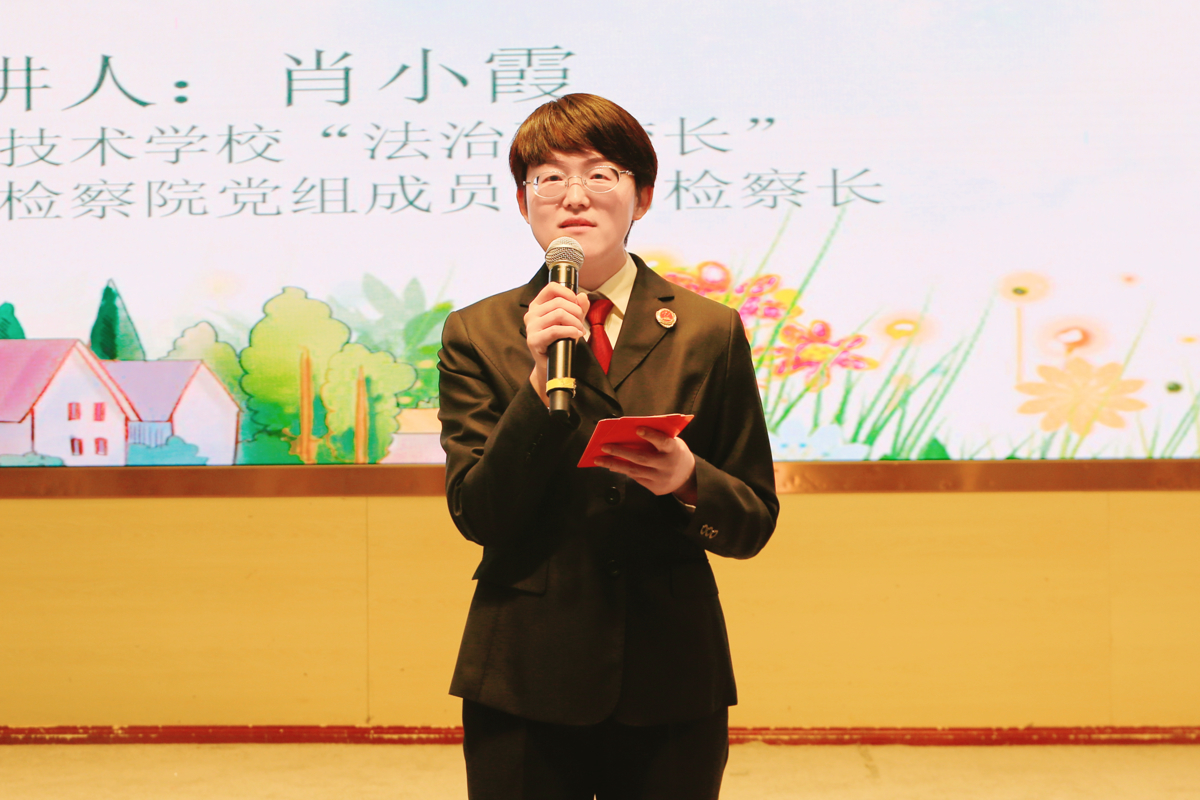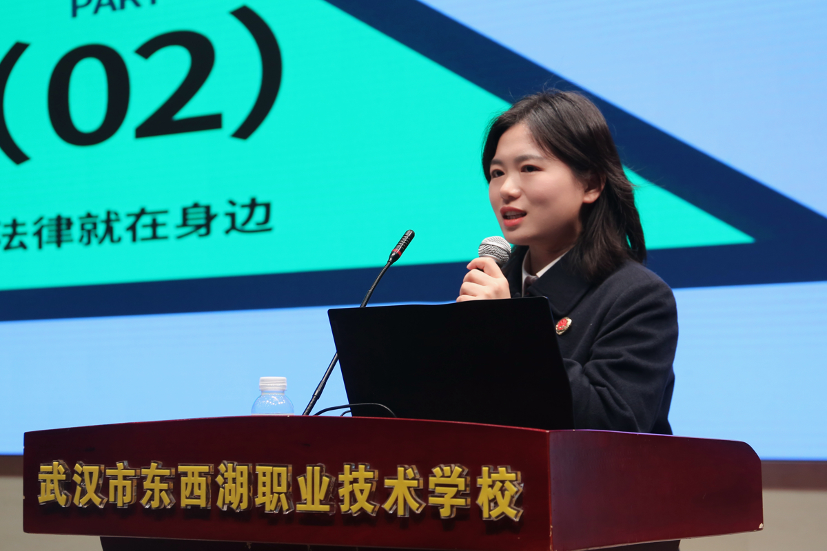 随后,东西湖职校春季学期“法治第一课”活动上,嘉宾们为师生带来了一场精彩纷呈的普法盛宴。活动在法治副校长罗晶洁和与会师生铿锵有力的诵读声中拉开序幕,罗校长带领全体学生诵读了《中华人民共和国法治宣传教育法》第四条的内容,让学生了解我国实行的是公民终身法治教育制度。紧接着,法治副校长肖小霞为同学们送上深情寄语,她教育同学们要敬畏法律、慎重交友、理性上网、勉励同学们勤学笃行,将法治意识悄然根植于脑海。