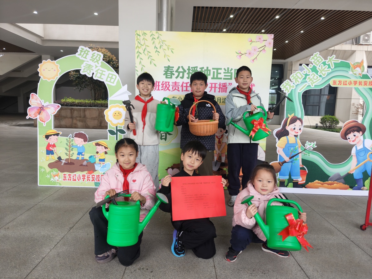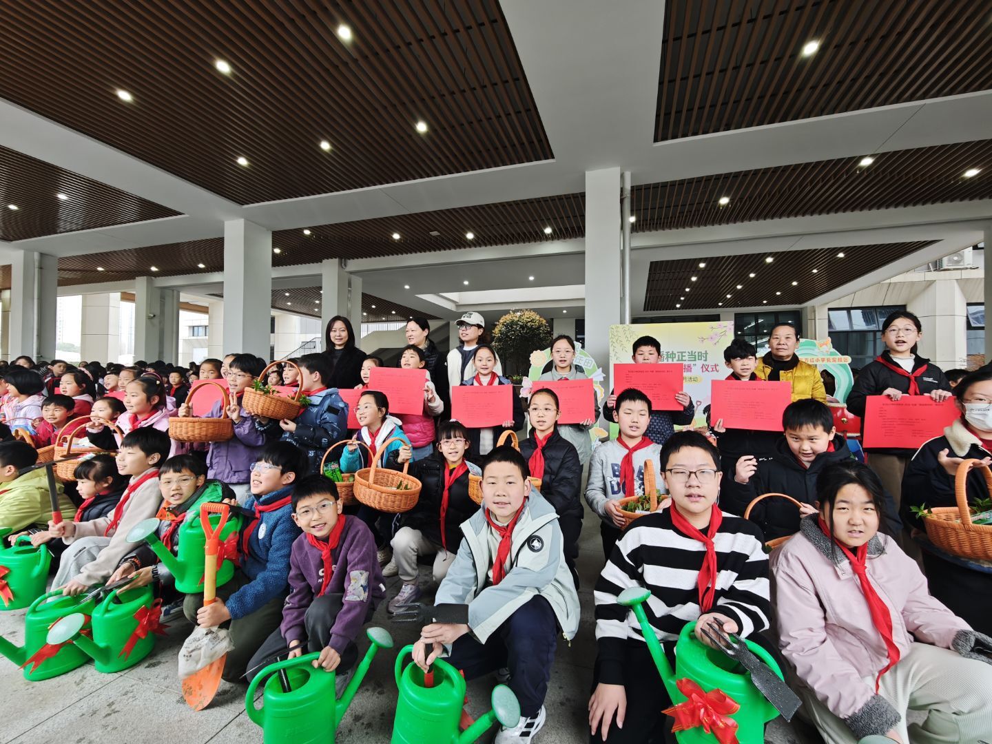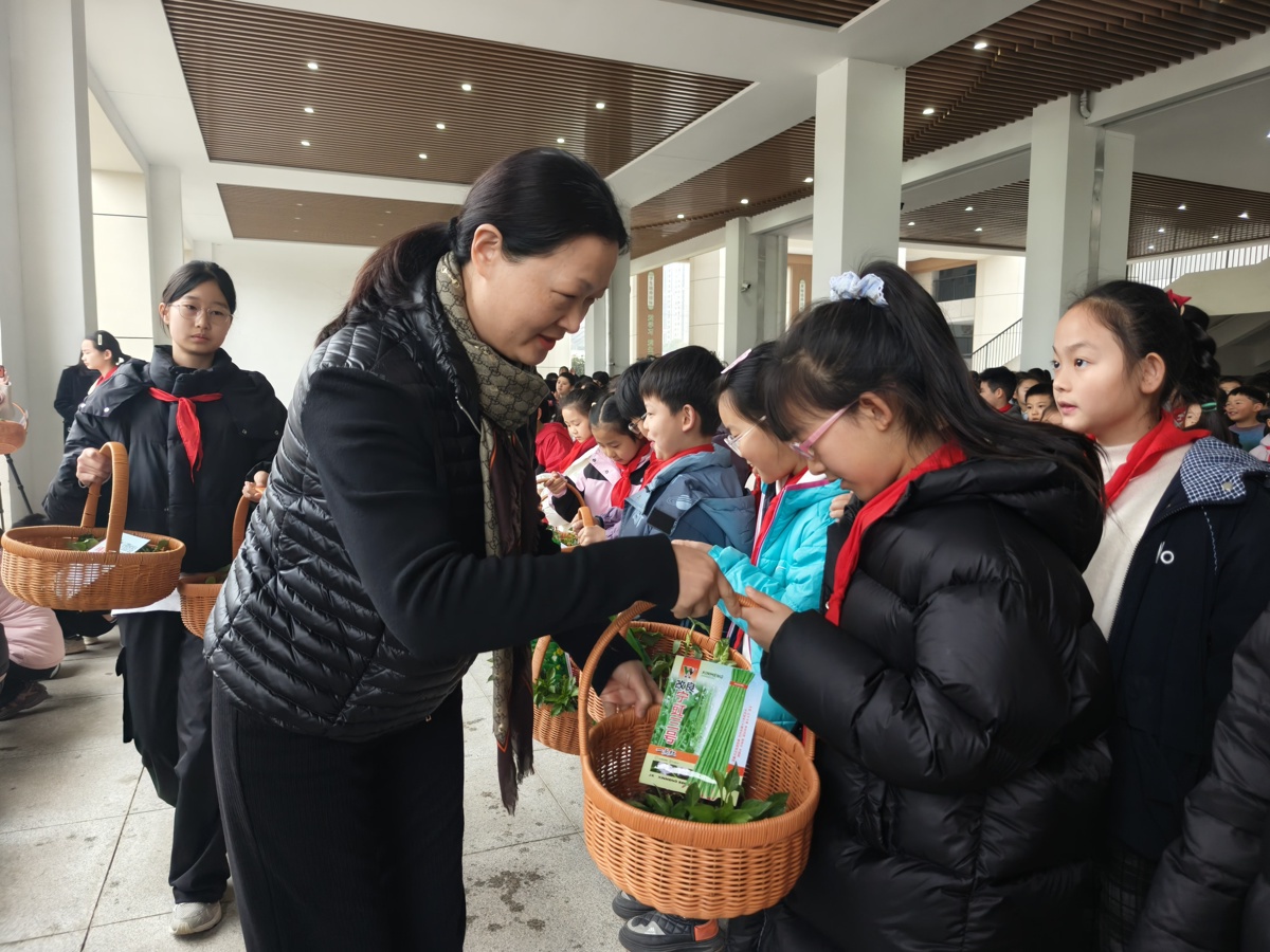 上午10时,开播仪式上,全校学生齐唱二十四节气歌、比拼班级劳动口号,稚嫩的童声回荡在校园。“授锄头”环节中,各班学生代表依次接过锄头、专属种子包和班级责任状。五年级学生王梓涵双手握紧责任状,眼里闪着兴奋的光:“我们班种茄子,我们一定能种出最大的那个!”