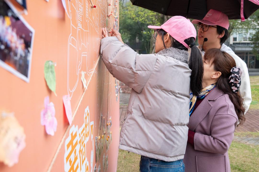 在“幸福坐标:师生集体创作”,大型校园地图吸引师生驻足参与。大家选定专属位置,钉上图钉、悬挂幸福卡片,共同绘制“狮山幸福地图”,无数意想不到的校园幸福故事在此汇聚。地图背面的留言区,师生们写下对幸福的思辨,让对幸福的理解从感官体验升华为哲学思考。