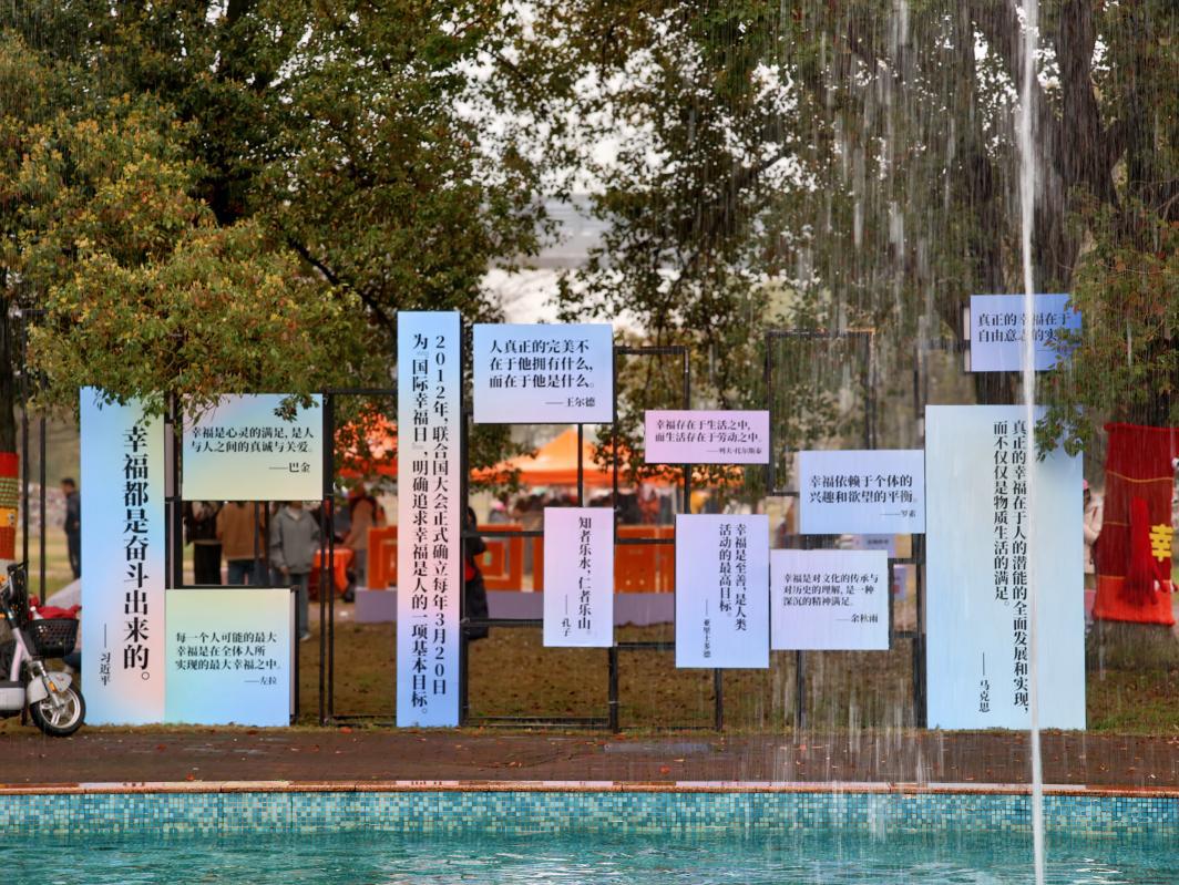 在活动现场,主造型装置汇聚古今中外哲学家、文学家、政治家等对幸福的经典阐释,从孔子“知者乐水,仁者乐山”的哲思,到习近平总书记“幸福都是奋斗出来的”的号召,再到马克思“真正的幸福在于人的潜能的全面发展”的观点,一字一句启迪师生对幸福的深层思考,探索新时代人的自由而全面发展的实践路径。