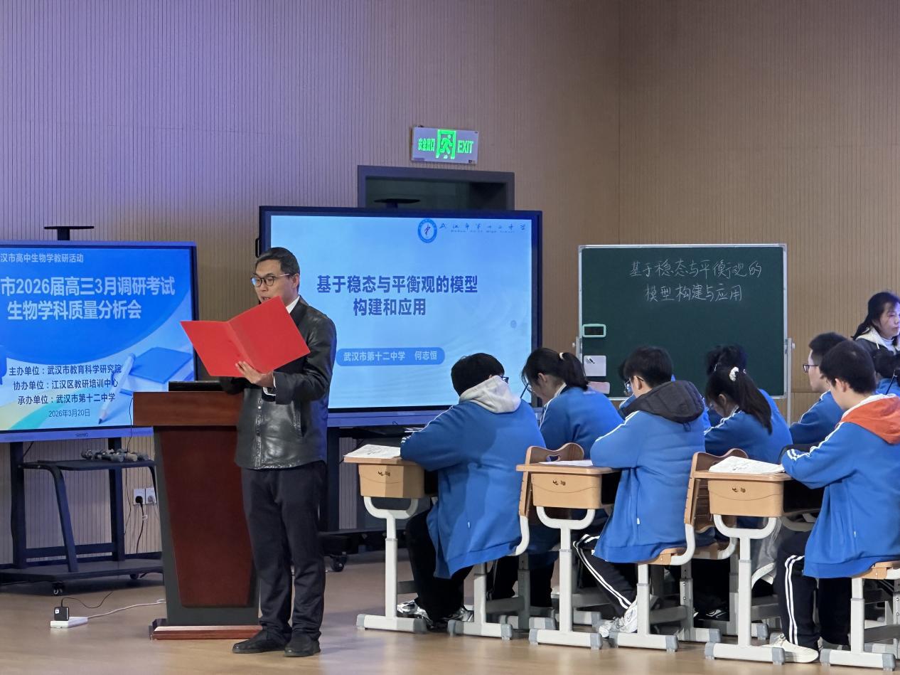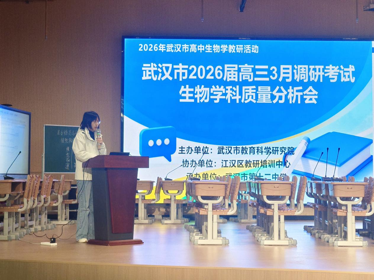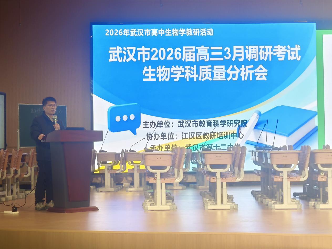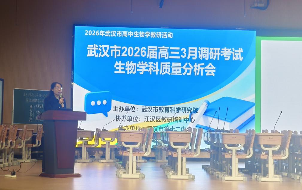 近日,武汉市高三三月调考生物学科质量分析会在武汉市第十二中学举行。分析会由武汉市教科院主办,江汉区教培中心协办,十二中承办,围绕数据剖析、课堂观摩、经验交流三大环节,为二轮复习明确方向。