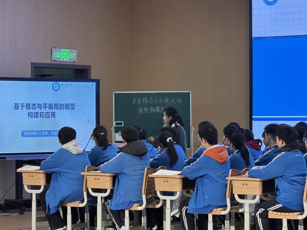 十二中高三年级备课组长何志恒老师展示《基于稳态与平衡观的模型构建和应用》示范课,以“找变量、定起点终点、推因果关系”三要素为核心,引导学生从课本原型到高考真题完成模型构建与应用。