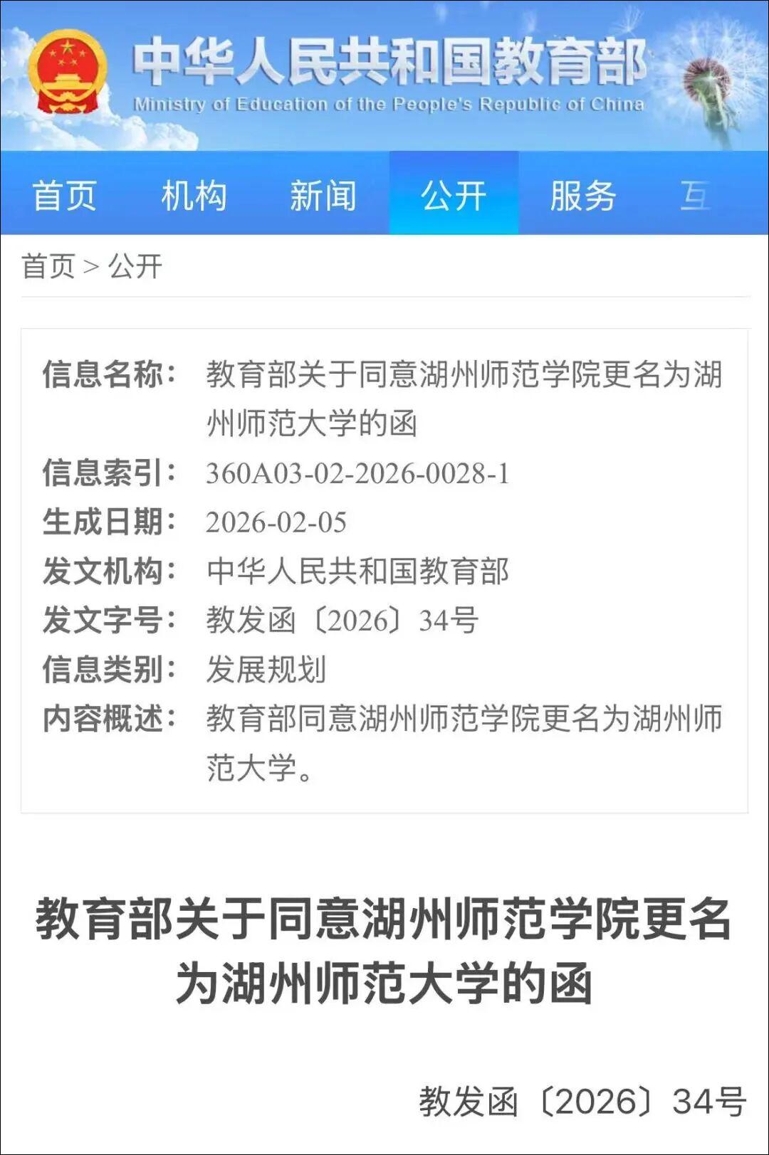《关于同意湖州师范学院更名为湖州师范大学的函》提出,同意湖州师范学院更名为湖州师范大学,学校标识码为4133010347;同时撤销湖州师范学院的建制。湖州师范大学为公办普通本科学校,以本科教育为主,同时开展研究生教育。学校全日制在校生规模暂定为17000人。