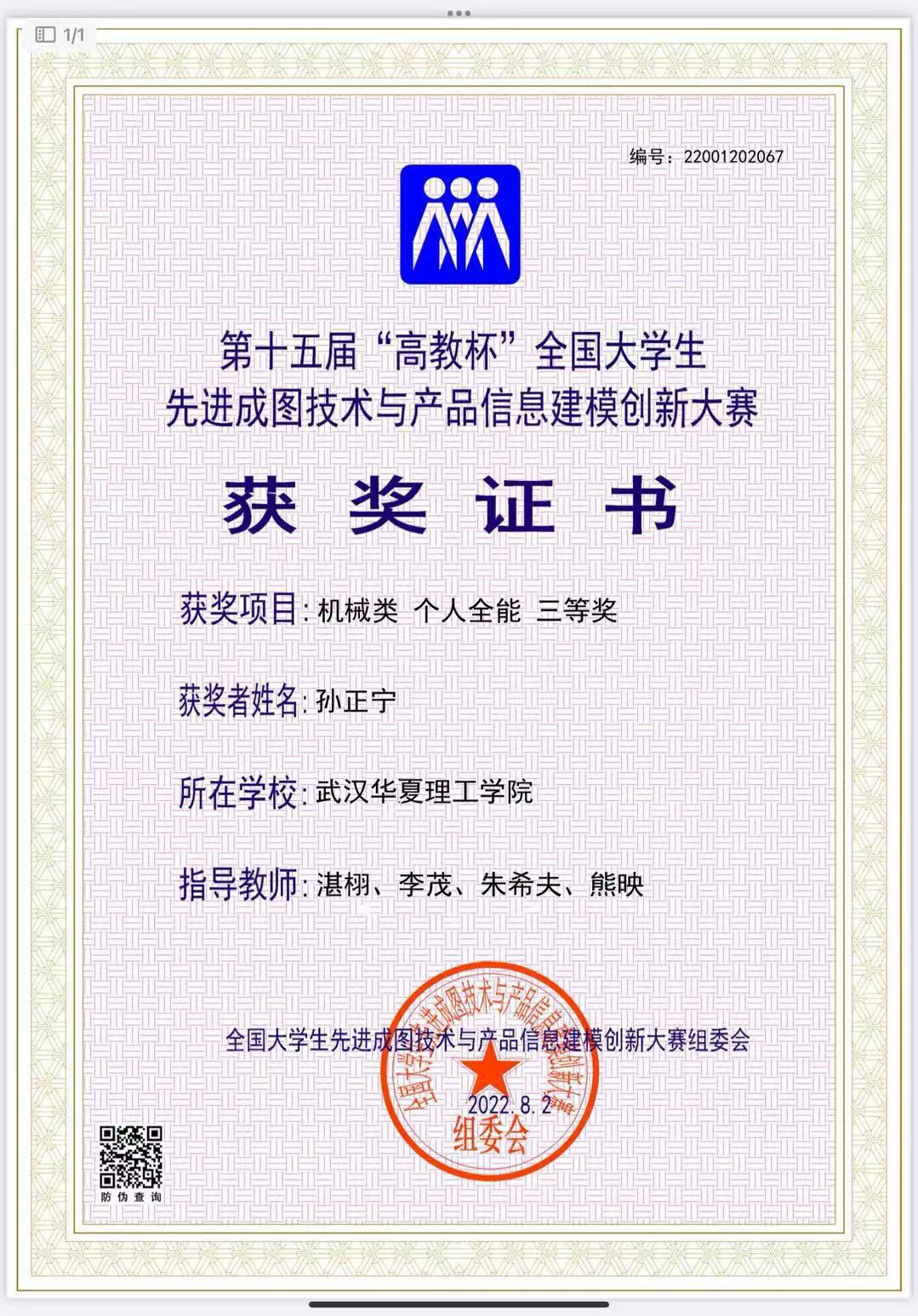 进入本科后,孙正宁一度有些迷茫,但很快找到了努力方向。大二时,他参加湖北省第二届大学生先进成图技术与产品信息建模创新大赛,一举斩获机械类个人一等奖。同年,又获得第十五届全国大学生先进成图技术与产品信息建模创新大赛机械类个人全能三等奖。“获奖后,他第一时间和我分享了喜讯。这两张获奖证书见证了孙正宁从职校生到本科生的巨大蜕变。”蔡文霞说。