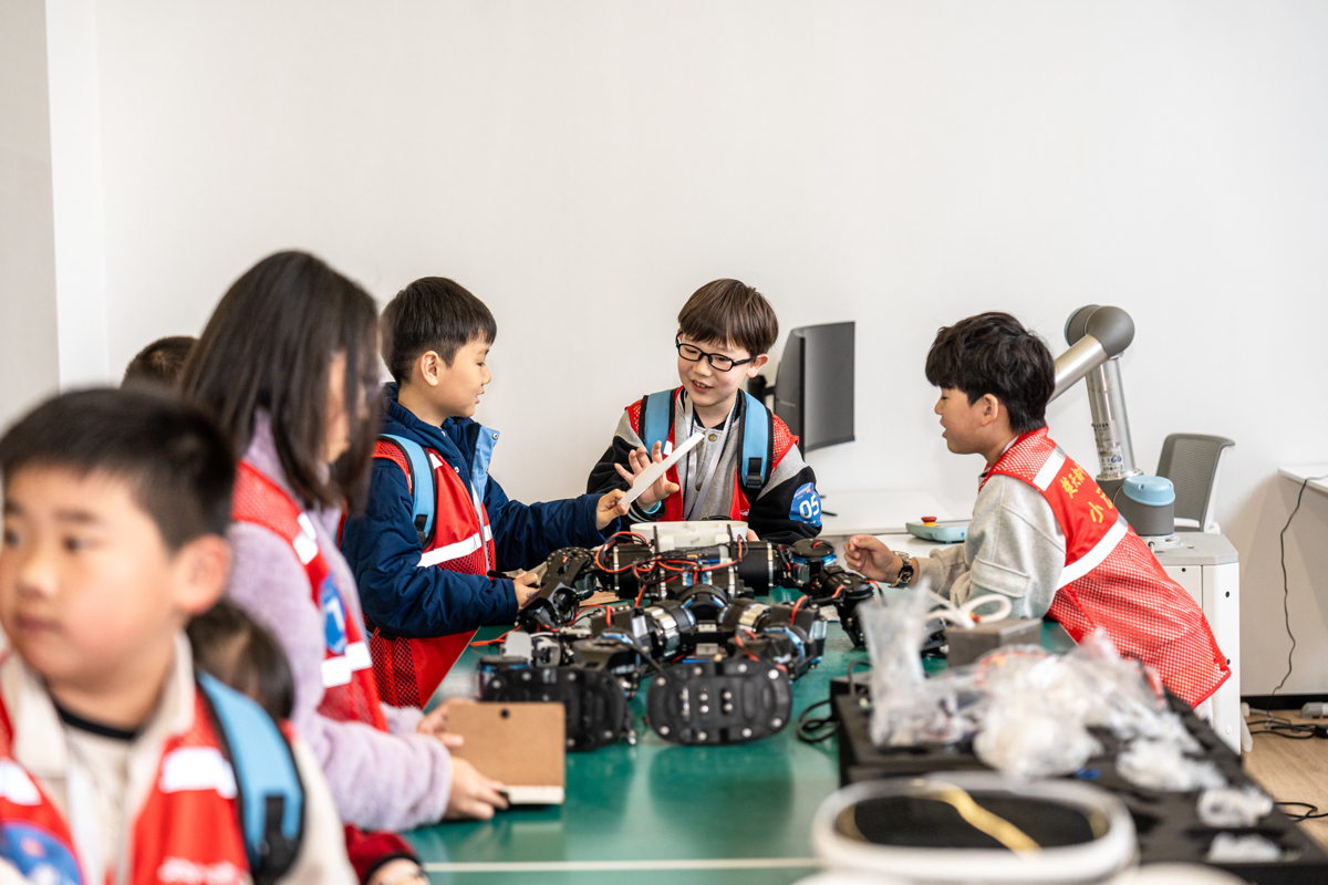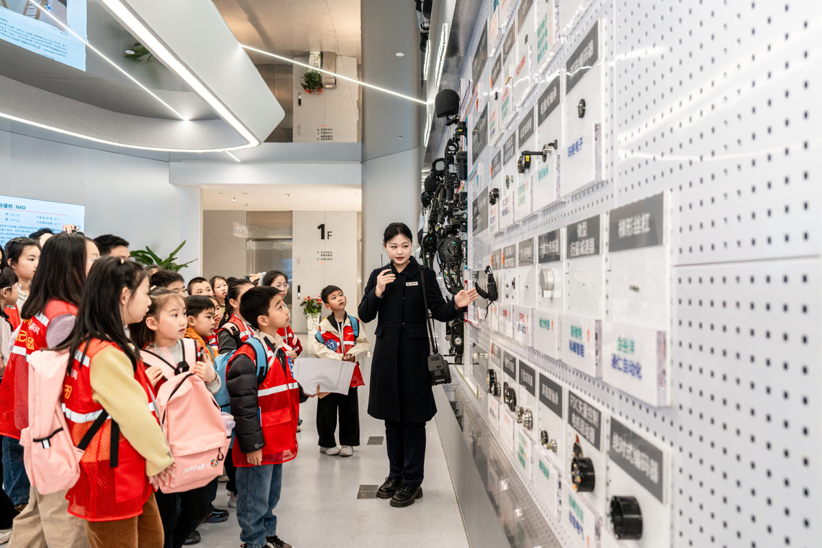 接着,小记者们又来到了机器人核心零部件展区,在这里,高精度伺服关节、灵巧手、电子皮肤、智能芯片等关键器件整齐陈列。“这是机器人的‘肌肉’和‘神经’,1克级灵敏度的电子皮肤,能让机器人感知轻触。”工作人员拿起一片小巧的传感器,小记者们围拢上前,轻轻触摸,眼中满是对科技的惊叹。