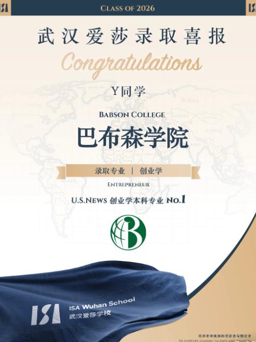 2026美本申请季,武汉爱莎印同学斩获巴布森学院(Babson College)本科录取。这所被誉为“企业家的摇篮”、创业学连续近30年全美第一的顶尖商学院,向武汉爱莎学子递来了橄榄枝。这封录取通知,也是华中地区近年来鲜见的顶尖商学院录取成果。