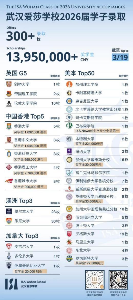 办学仅三年半,从剑桥大学到加州理工学院,再到巴布森学院,每一份优异成绩背后,都是武汉爱莎一以贯之的理念:教育的高度,不体现在榜单的长度,而体现在学校能否成为学生成长的沃土。