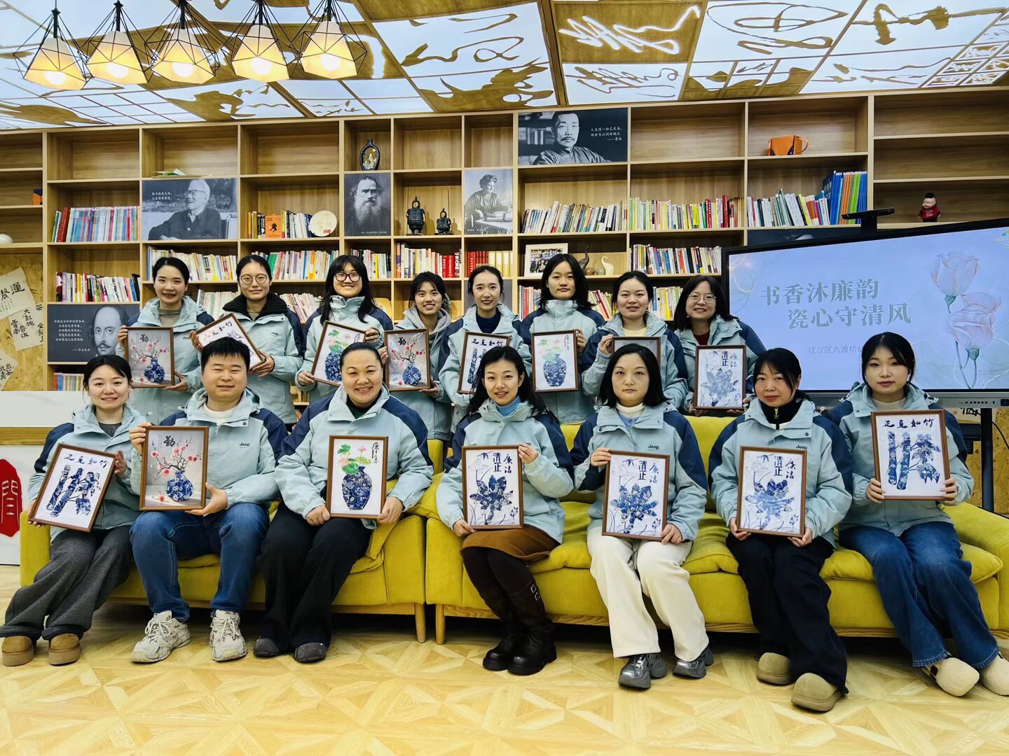 活动的高潮,是一场青花瓷贴片创作。老师们走进创意工坊,在了解青花瓷“清白素雅”的文化内涵后,分组协作,以“廉洁护童心”“清风满校园”为主题,用镊子小心地粘贴青花贴片。莲纹、云纹在指尖绽放,蓝白相间的作品逐渐成型。创作完成后,大家互相点评,解读各自作品中的廉洁寓意。“没想到清廉教育还能这么做,既动手又动脑,印象特别深。”