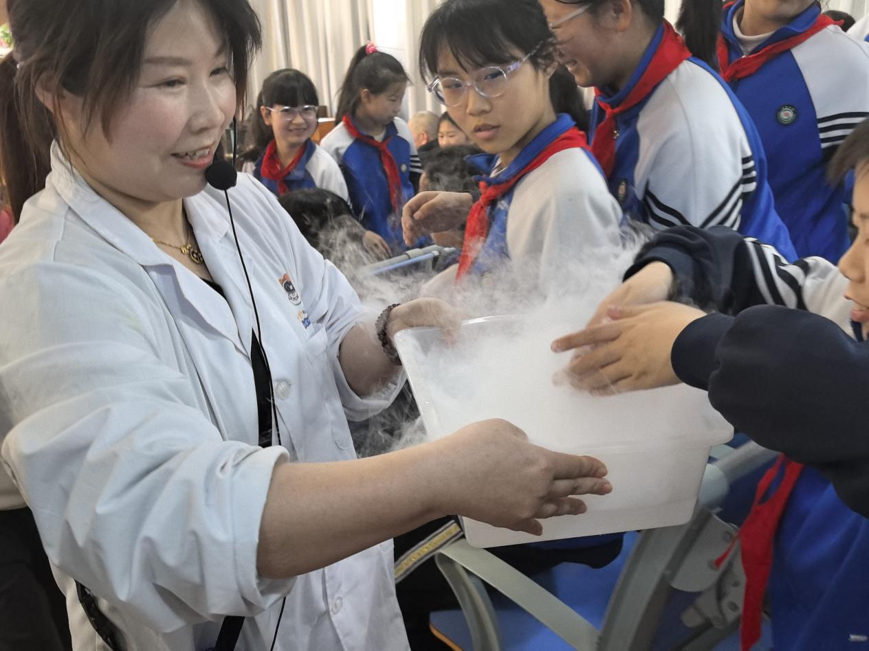 老师也被邀请上台,与同学们携手完成“火焰接龙”,师生同台体验科学的神奇。博士一边演示一边揭秘:“手上的水膜起到了低温保护作用,火焰热量向上扩散,这才让我们能安全体验。”一位刚体验完的同学兴奋地说:“原来火并不可怕,读懂科学就能掌握它!”