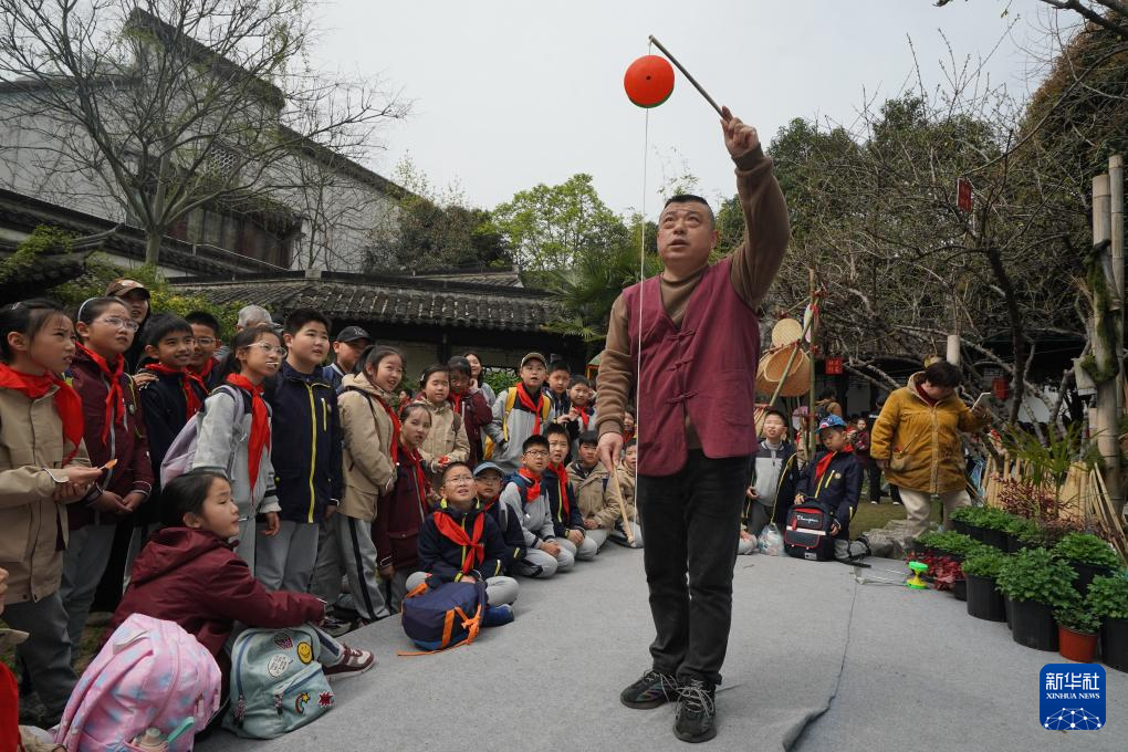 3月26日,非遗传承人向学生展示抖空竹技艺。