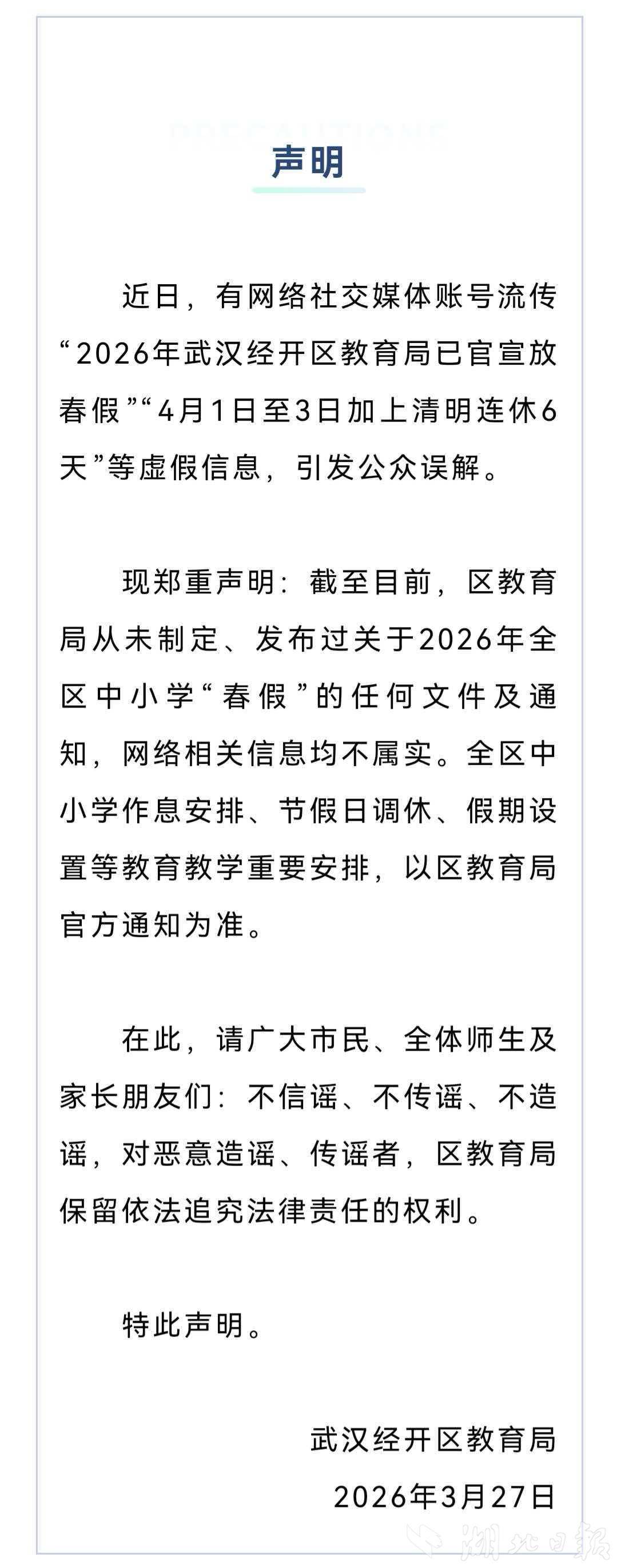 湖北日报讯(记者张倩倩)“武汉要放春假了?”近日,一则消息在家长群和社交平台刷屏,青山区、经开区等多地家长纷纷询问学校是否收到通知。3月27日,武汉经开区教育局率先辟谣,称“网络相关信息均不属实,以区教育局官方通知为准”。此前,青山区、硚口区教育局也向本报证实,网传“4月1日起放春假”系不实信息。