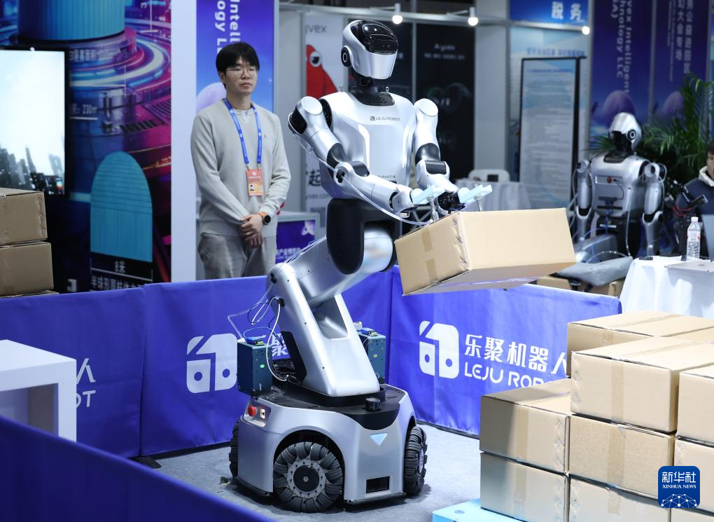 3月27日,在2026北京国际科幻与未来产业博览会现场,一款机器人在展示搬运箱子。