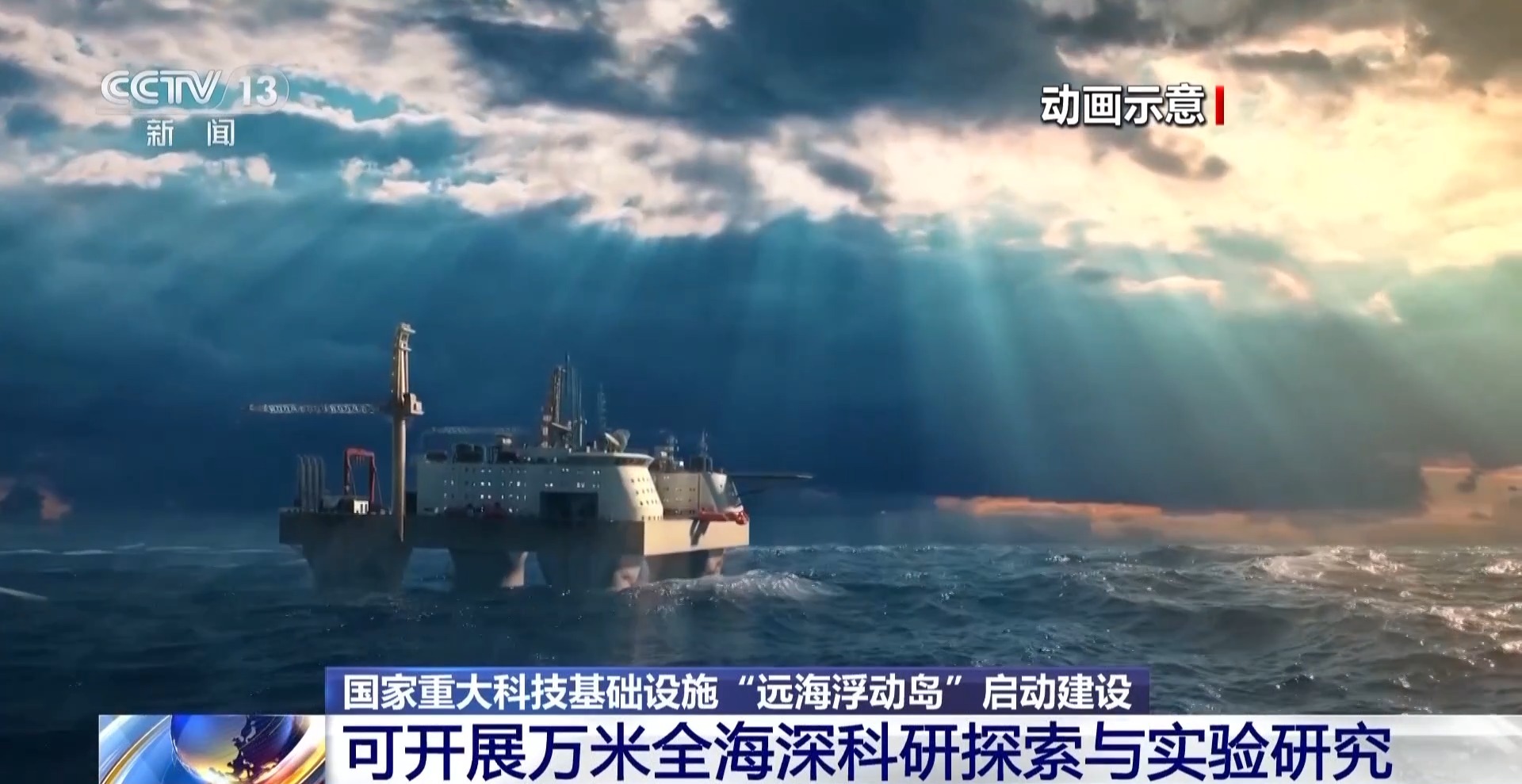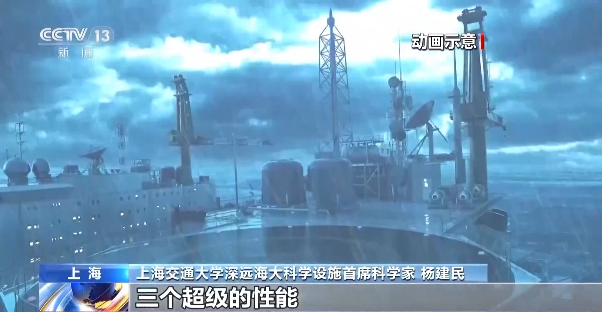 上海交通大学深远海大科学设施首席科学家 杨建民:基本上可以和原来的科考船一样快速航行,那么如果到达作业区域以后,要进行研究试验,那么就把它压载下去。超大重载、超长驻留、超强抗台风,三个超级性能能够做更加恶劣海况、更长时间、更深的海水,可以开展这方面的工作。