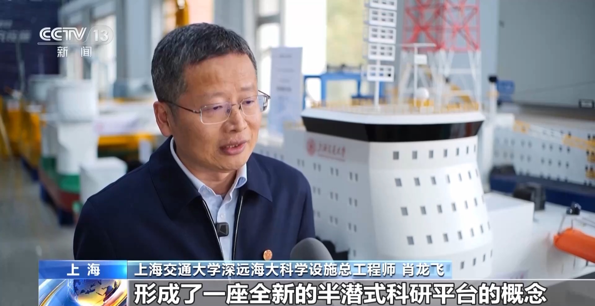 上海交通大学深远海大科学设施总工程师 肖龙飞:国家的海洋科研设施,像海洋深水试验池、海洋科考船、深海潜水器等各种类型。但缺少一种能够既快速航行,又能够长时间在一个任务海域进行作业的科研设施。把海洋油气领域的半潜式平台和科考船的特点融合在一起,形成了一座全新的半潜式科研平台的概念。