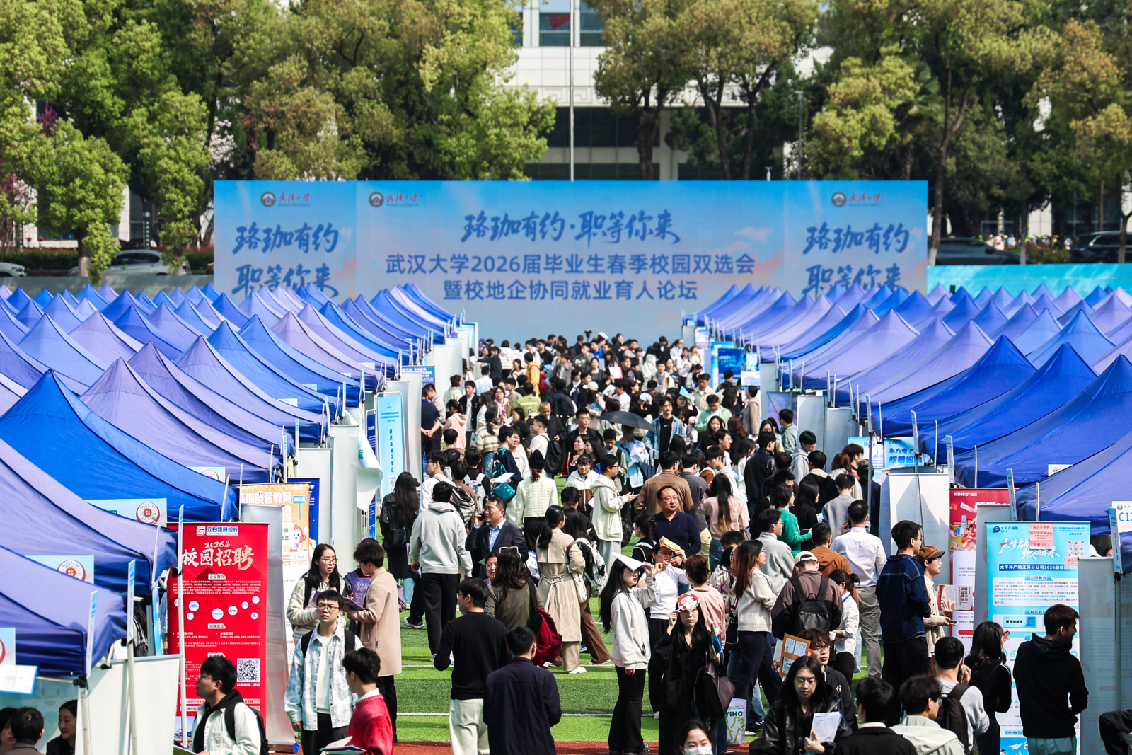 3月28日,武汉大学信息学部操场上人头攒动,“珞珈有约 职等你来”武汉大学2026届毕业生春季校园双选会暨校地企协同就业育人论坛在这里火热举行。