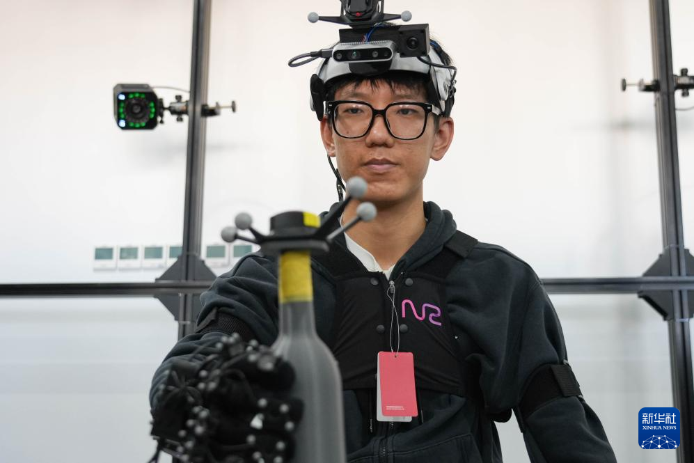 3月18日,在北京中关村(海淀)具身智能创新产业园,诺亦腾机器人的一名工作人员在进行高精度人类行为数据采集。