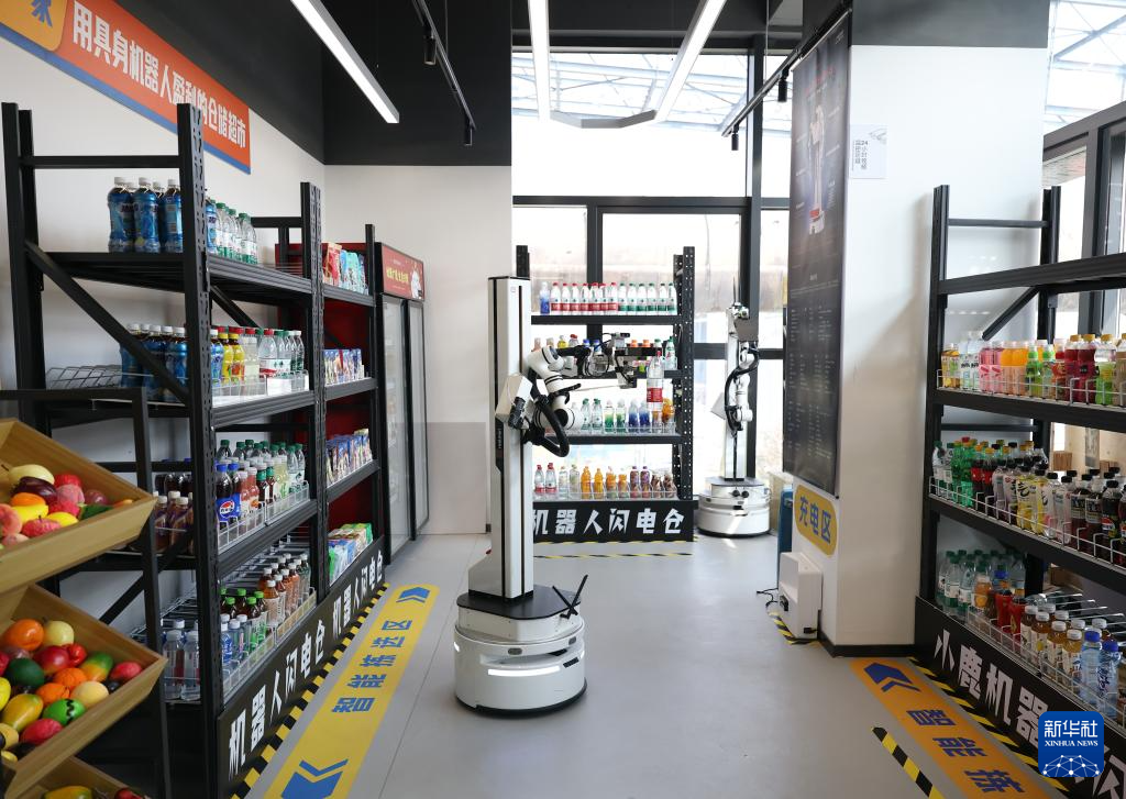 3月25日,在北京市石景山区首钢园内的人形机器人数据训练中心,一款机器人在模拟“商超”场景中工作。