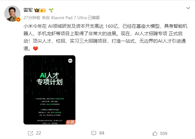 3月30日,小米创办人、董事长兼CEO雷军发文表示,小米今年在AI领域研发及资本开支高达160亿元,已在基座大模型、具身智能机器人、手机龙虾等项目上取得了非常大的进展。现在,AI人才招聘专项正式启动!顶尖人才、校招、实习三大招聘项目,打造一站式、无边界的AI人才引进通道。