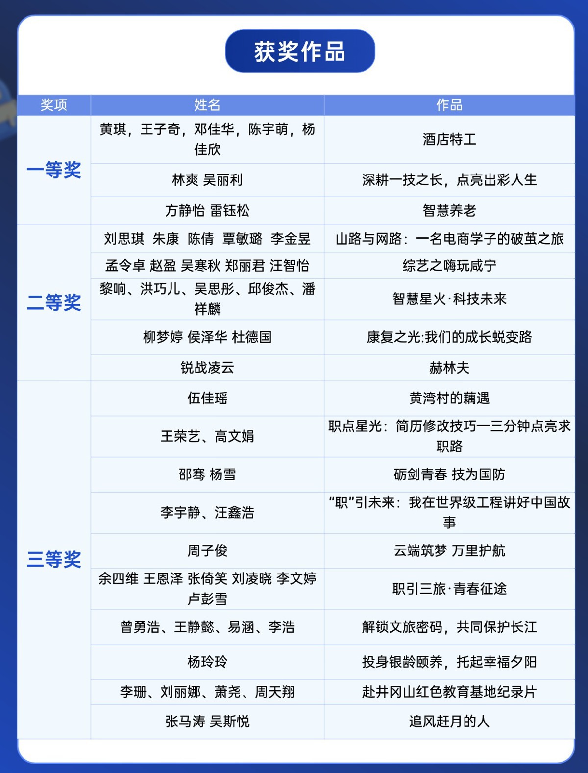 经过网络推荐和专家评审,大赛评出一等奖3个、二等奖5个、三等奖10个(如下表),武汉职业技术大学、武汉交通职业学院、长江职业学院、湖北科技职业学院、武昌职业学院获优秀组织奖,郑广东、佟安安、王振宇、於凌翔、张文博、罗冠、朱丽、谌雪莹、李鹏、杨贝乐获优秀指导老师奖。