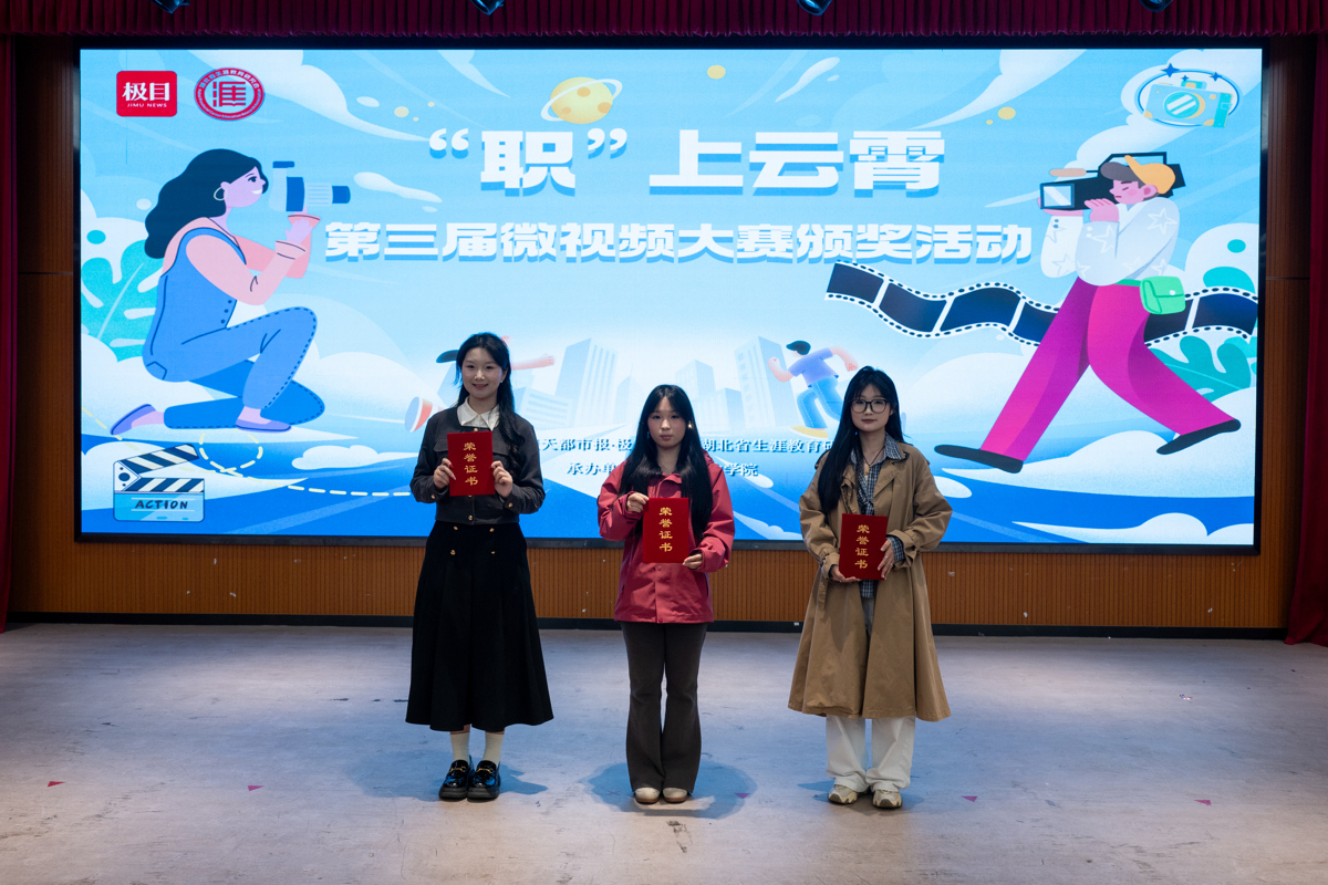 用AI炫技展示未来酒店客服人员的专业与敬业,将对爷爷奶奶的关爱转化成学习智慧养老专业的初心,从高考失利的落寞中奋起赢得全国技能大赛的荣光……这些属于职业院校大学生的成长故事,通过微视频的方式娓娓道来。3月29日,由湖北省教育厅指导,楚天都市报·新闻联合湖北省生涯教育研究会主办的第三届“职”上云霄微视频大赛颁奖暨高职院校新媒体传播创新交流活动,在武昌职业学院举行,现场颁发了一二三等奖和优秀组织院校、优秀指导老师奖项。