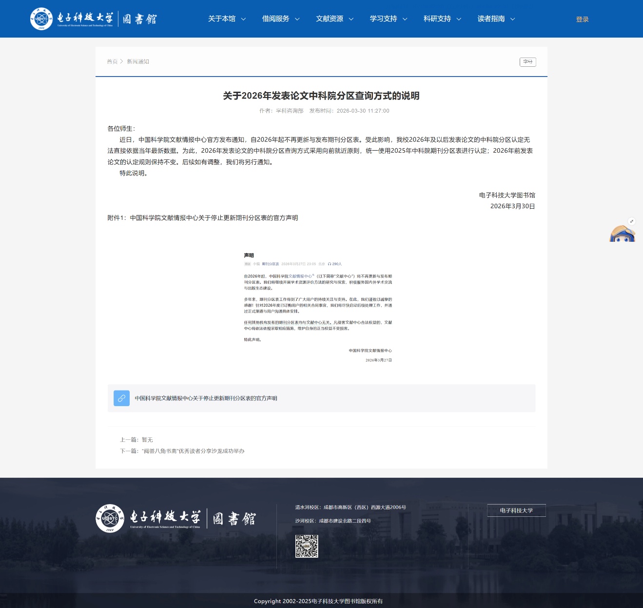 3月30日,电子科技大学图书馆在官网发布了《关于2026年发表论文中科院分区查询方式的说明》:近日,中国科学院文献情报中心官方发布通知,自2026年起不再更新与发布期刊分区表。受此影响,我校2026年及以后发表论文的中科院分区认定无法直接依据当年最新数据。为此,2026年发表论文的中科院分区查询方式采用向前就近原则,统一使用2025年中科院期刊分区表进行认定;2026年前发表论文的认定规则保持不变。
