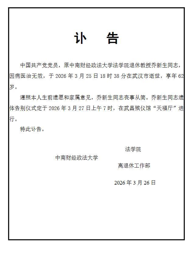 3月26日,中南财经政法大学离退休人员工作部发布讣告:中南财经政法大学法学院退休教授乔新生,因同志病医治无效,于2026年3月25日在武汉市逝世,享年62岁。