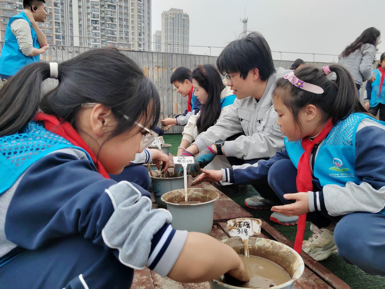 401班邓熙贝同学捧着自己刚栽好的碗莲,高兴地说:“原来种荷花有这么多科学道理,我特别期待我们组的碗莲能快点长出叶子!”402班凌晨歌同学则在观察本上认真记下了今天的日期和实验编号。