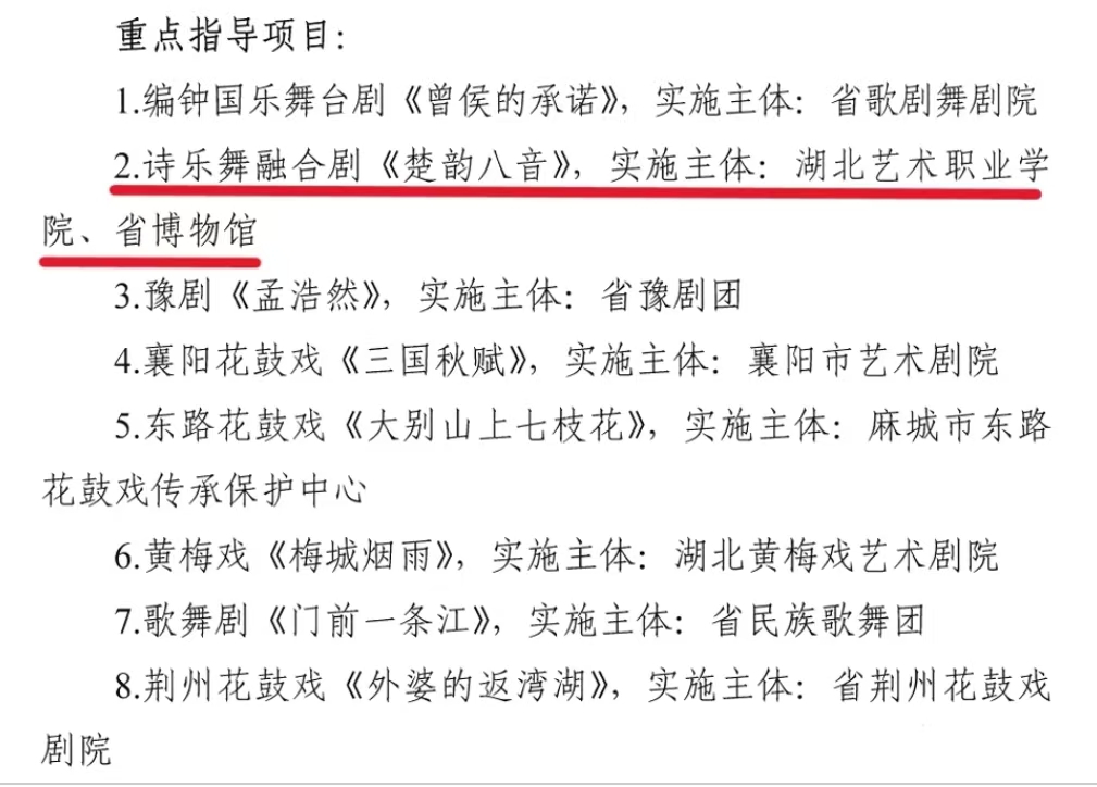 近日,湖北省文化和旅游厅公布湖北省舞台艺术精品创作扶持工程入选项目名单,湖北艺术职业学院与湖北省博物馆联合申报的诗乐舞融合剧《楚韵八音》成功入选大型舞台艺术重点指导项目,这是该校深耕荆楚文化艺术创作取得的重要成果。