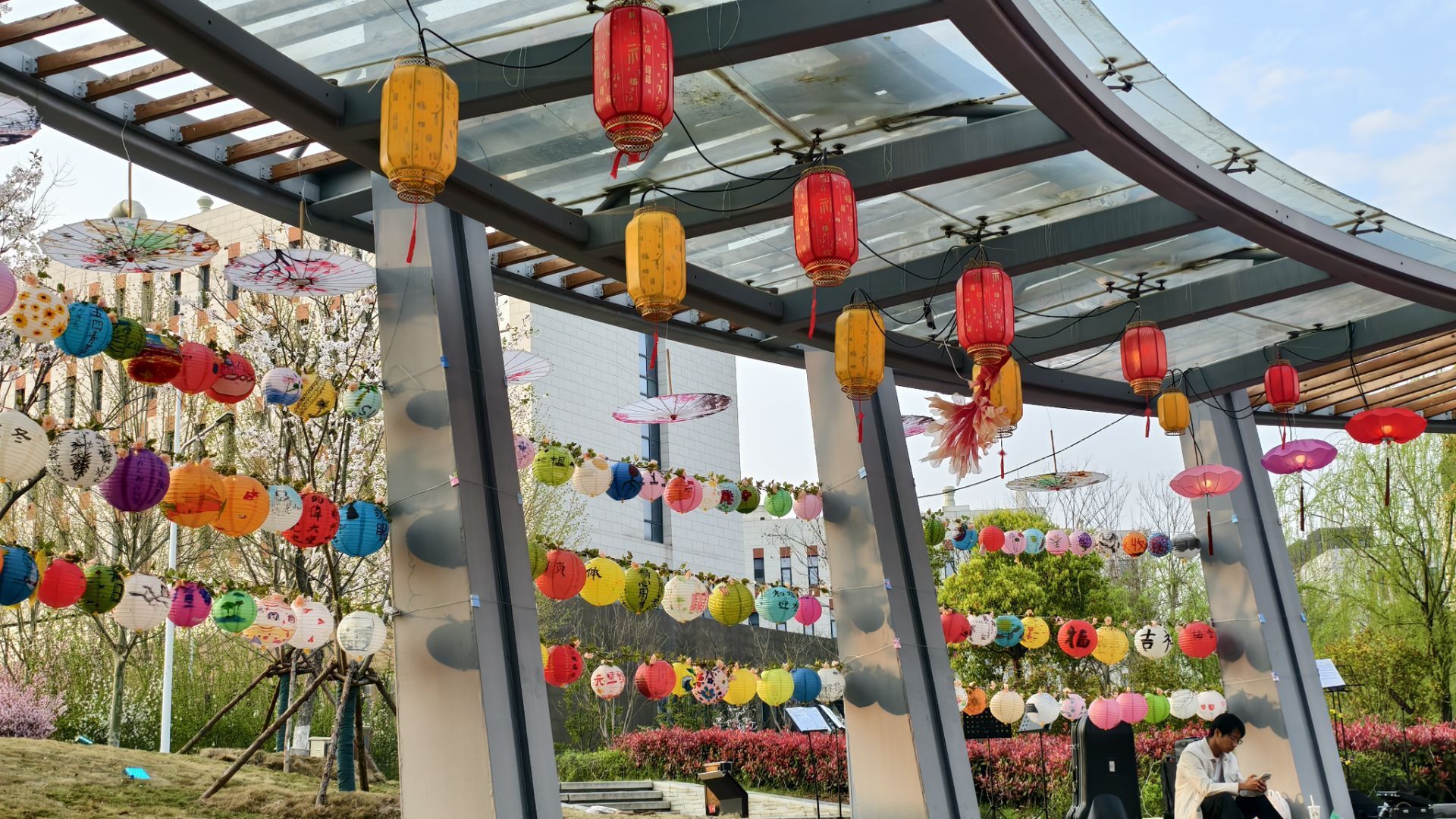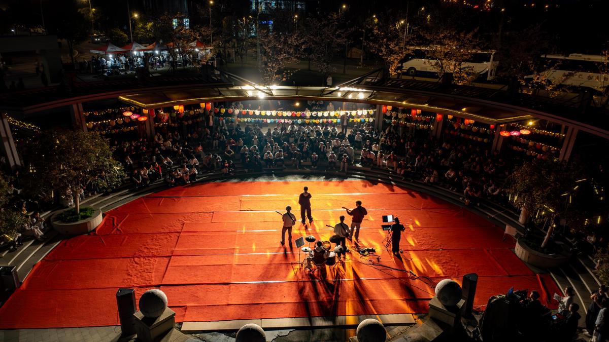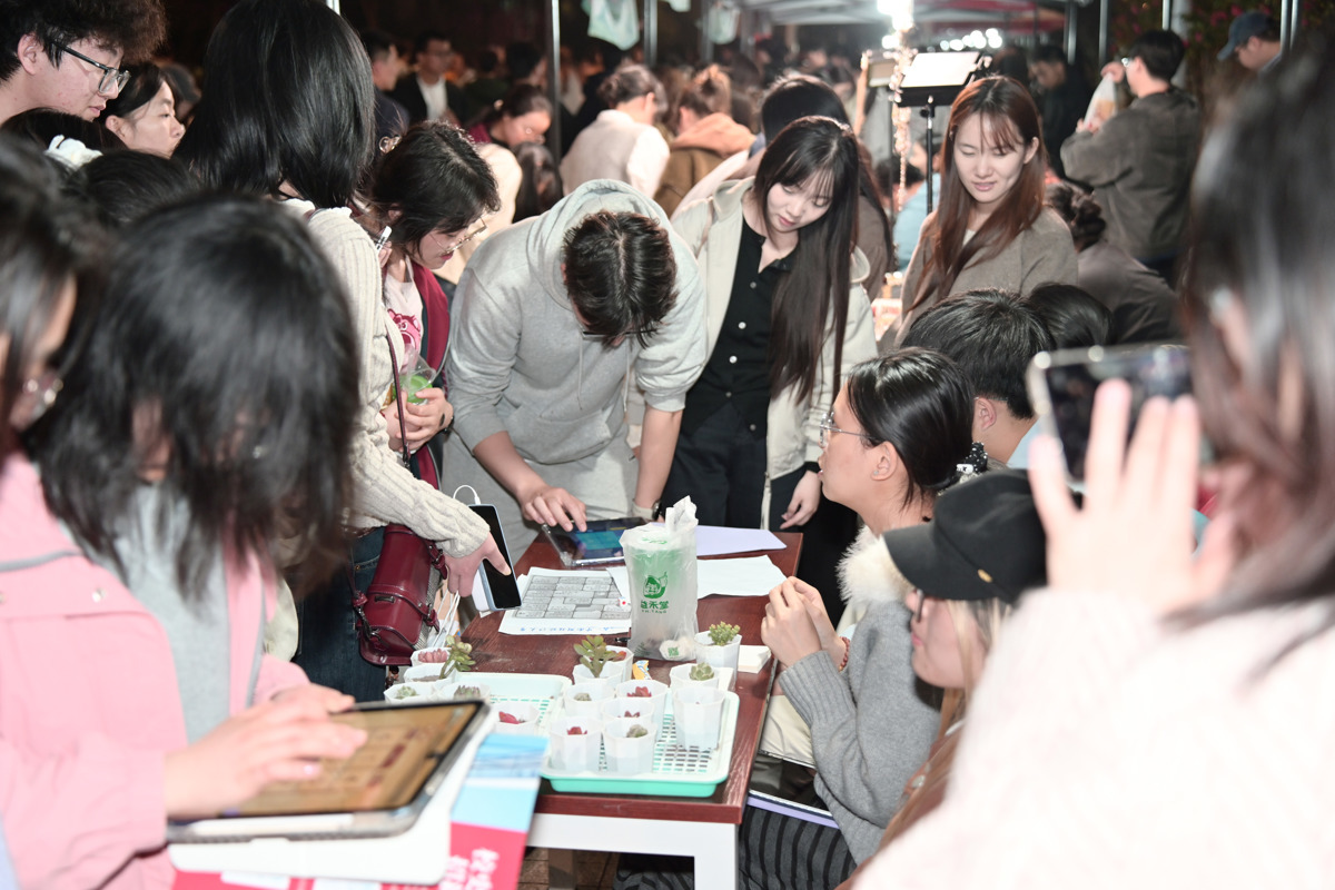 除灯展外,文化展演、青春市集、快闪巡游、环保河灯等活动同步开展。露天剧场内,新中式民乐与乐队碰撞出独特韵律,时装走秀、民族舞、古典舞将气氛推向高潮;青春市集中,领养绿植、书画体验、拼贴诗词、春日影像等摊位前人潮涌动,同学们沉浸式体验传统文化。快闪巡游时,舞蹈团、模特队、石榴籽民族文化社等沿湖前行,以动感旋律和舞姿点燃全场热情。本次灯会还创新设计了“河灯寄福”,师生们将写满心愿和祝福的河灯轻轻放入湖中,点点微光与湖面主景观交相辉映,水光与灯火相互交融,勾勒出一幅诗意盎然的校园夜景。