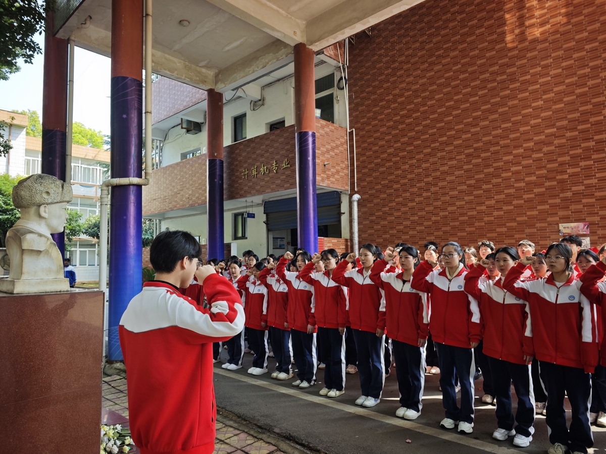 在“雷锋精神永驻心间”环节,在主持人24电1郭正阳同学的引导下,全体师生肃立默哀,同学们缓步上前,将前一日下午手工制作的白、黄两色纸菊花敬献于雷锋雕塑像前,以亲手制作的花束寄寓哀思,致敬雷锋同志无私奉献的崇高品格。思政组王丹老师结合实景带来思政微课,带领师生重温英烈事迹,深刻阐释新时代青年传承英烈精神的责任与担当。