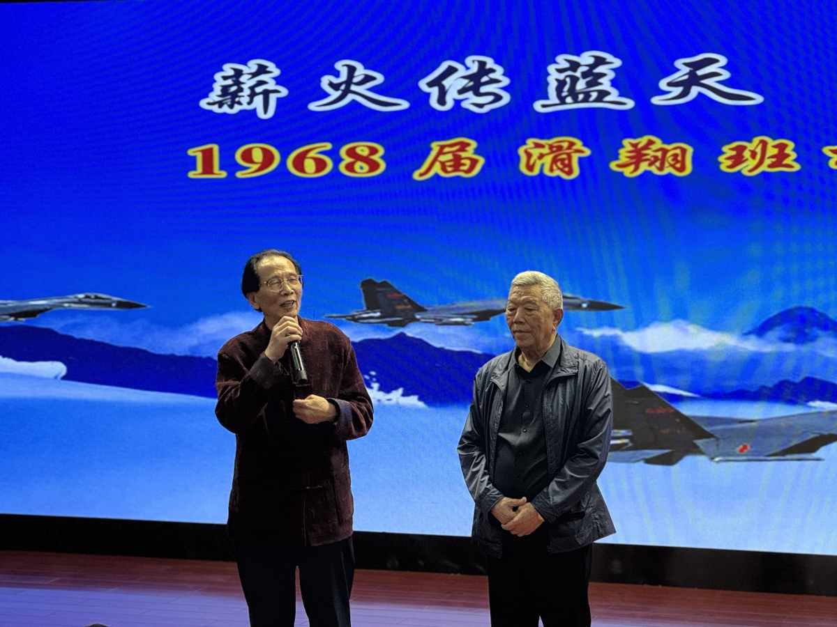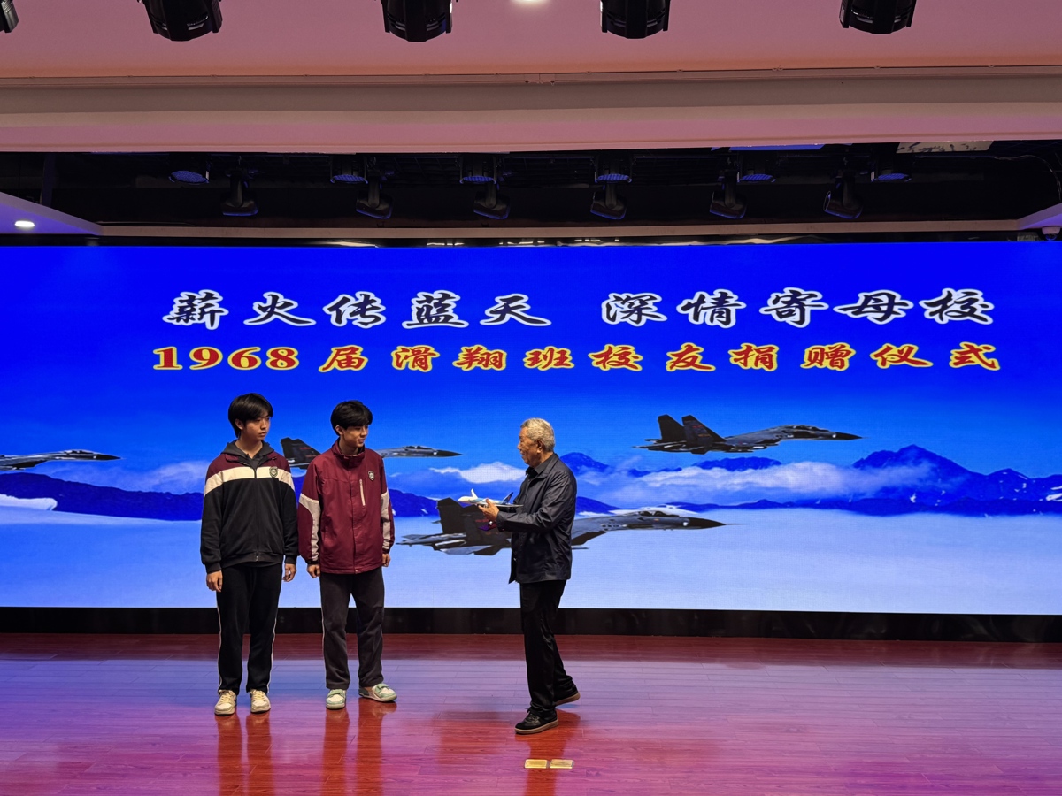 在全场见证下,捐赠仪式正式举行。1968届滑翔班校友代表向学校捐赠飞机模型,学生代表上台接受这份特殊的礼物。一架小小的飞机模型,成为跨越半个多世纪的情感纽带,既承载着校友们对母校的深情厚谊,也寄托着对母校航空特色教育发展的殷切希望。