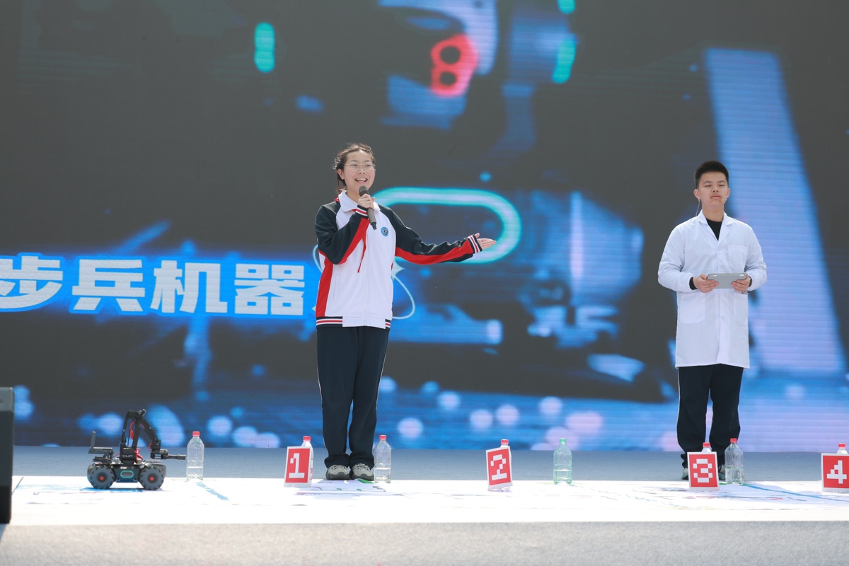 4月1日上午10时许,14岁的武汉市光谷第二初级中学(下文简称“光谷二初”)808班学生雷胤天,忐忑登上学校科技节主展台——接下来他要展示的机器车项目对现场信号、地面状况的要求高,此前多次彩排都未“一条过”。正式表演第一次,失败。小雷的“助理”、同班同学肖惠予立马救场:“没事,大家鼓励一下,我们再来!”主持人杨玉娟老师也赶紧按原计划托底、打气。这一次,成功了。