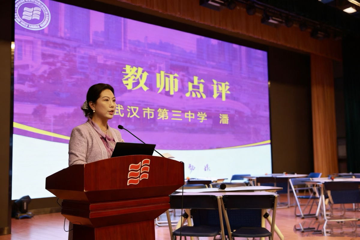 活动一开始,武汉三中教务主任蔡芳从容主持,校长张才清热情致辞,为这场干货满满的研讨活动拉开序幕。随后,武汉三中青年教师倪芷馨带来一堂别开生面的AI赋能读写教学研讨课,以生动的实践形式,让在场教师直观感受到AI技术融入课堂的独特魅力。课例展示结束后,倪芷馨分享了自身的授课思路与实践心得,武汉三中英语学科带头人潘炜现场点评、精准指导,给出了兼具针对性与实用性的改进建议。