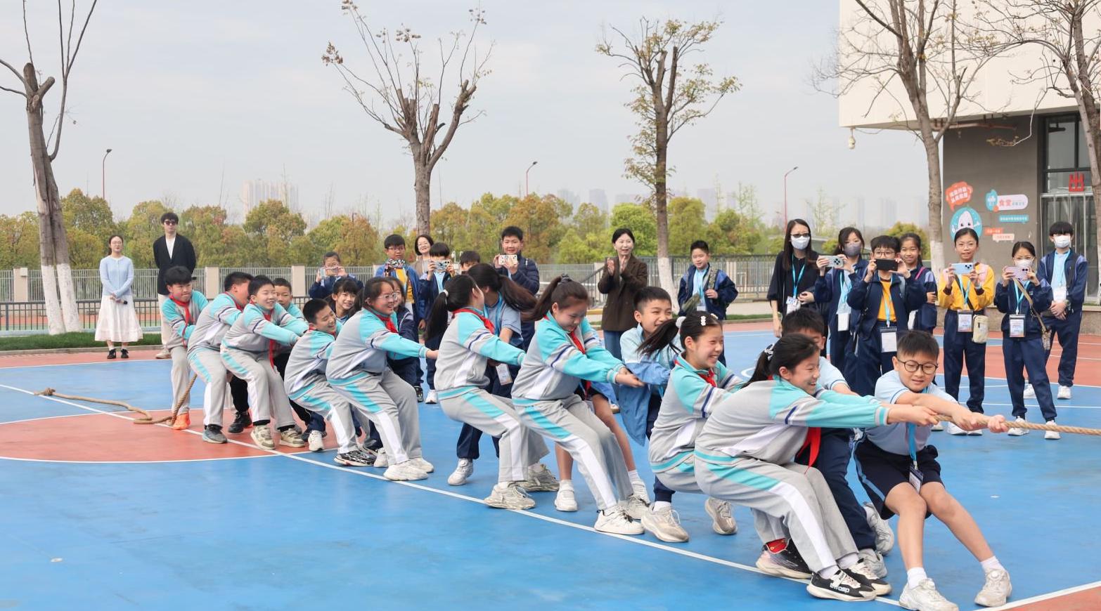 活动伊始,欢快的器乐表演拉开欢迎序幕,红领巾讲解员带领香港师生漫步校园,细致介绍学校文化与军运特色。操场上,啦啦操活力四射、军运文化展示精彩纷呈,随后两校学生开展友谊拔河,在协作中快速拉近距离。