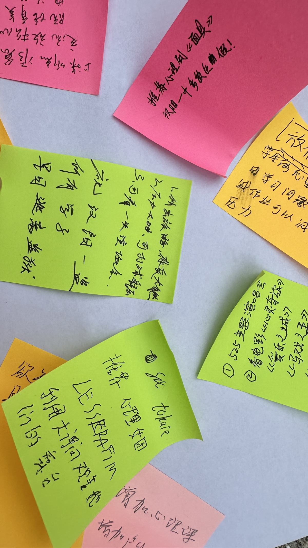 在“春日献策・心护航”环节,全体心理委员化身校园心理健康的“智囊团”,借助便利贴,围绕班级心理健康教育工作认真思考、各抒己见。大家结合班级实际情况,将心中所想落笔成字,从情绪疏导技巧、同伴陪伴方法,到心理宣传形式、特色活动组织,一个个具体思路、一条条实用建议,凝聚着心委们的责任与智慧,也为学校后续开展心理健康工作提供了鲜活的青春视角。一场春日拓展,一次心灵成长,更是一份责任的再出发。活动结束后,参与的心理委员们纷纷分享自己的真实感悟,字里行间满是收获与坚定:“用便利贴为班级心理工作出谋划策,让我明白小小的行动也能带来大大的温暖,我愿意做班级里的那束光。”“大自然让我放松了许多,也更清晰地看到自己的优势,我会把这份温暖与力量带回班级。”