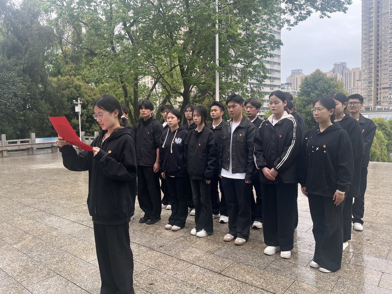默哀毕,领誓人带领全体团员青年代表及入党积极分子高举右拳、庄严宣誓,重温入团誓词。“我志愿加入中国共产主义青年团……”铿锵的誓言响彻陵园上空,字字千钧,凝聚着新时代青年赓续红色血脉、践行初心使命的坚定决心。宣誓结束后,学子们列队缓步前行,依次将手中洁白的菊花轻轻敬献于纪念碑前,以鲜花寄哀思,以躬身表敬仰,整个献花过程井然有序,尽显对革命英烈的尊崇与缅怀。