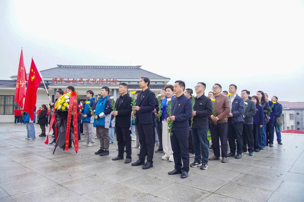 仪式最后,学校领导向革命烈士敬献花篮,师生代表与老党员依次上前献花。细雨纷飞,素菊寄情,全体人员绕碑缓行,瞻仰英烈姓名。随后,在讲解员带领下,大家参观了将军山红色文化陈列馆,通过珍贵的历史照片、文献资料与实物展品,重温革命岁月,深刻感悟革命先辈不畏艰险、浴血奋战的英雄气概。