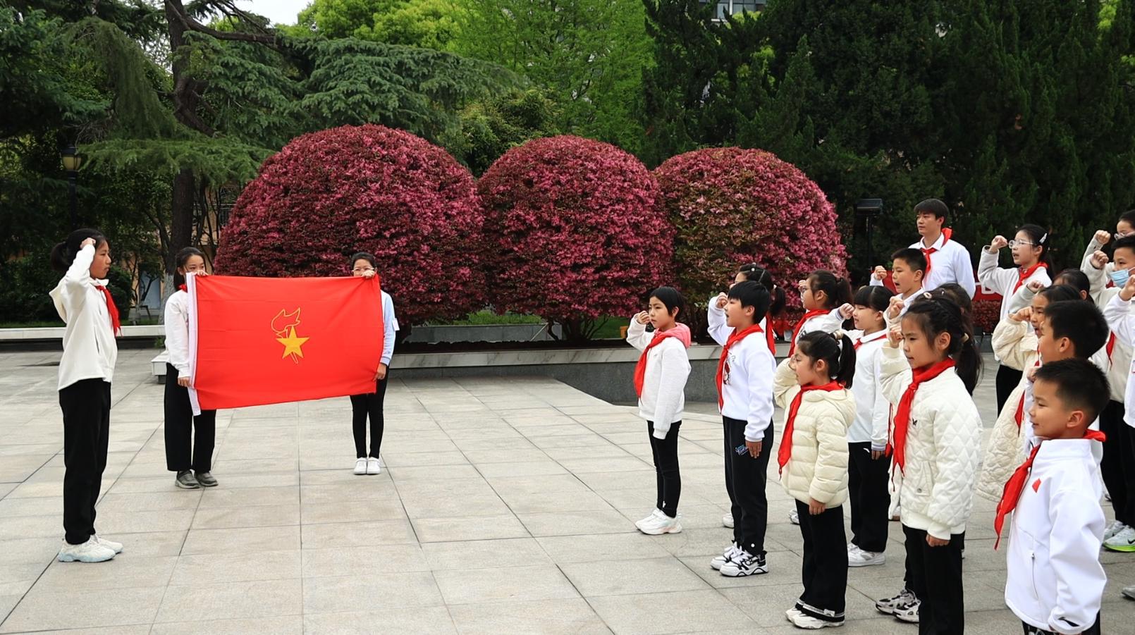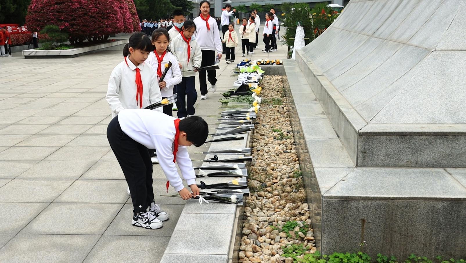 “林祥谦爷爷,您听——‘头可断,血可流,工不可复。’这句话,我们记住了!”二七烈士纪念碑前,队员代表的献词声稚嫩而坚定,穿越时空与先烈“对话”。全体人员肃立默哀,风过松柏的轻响中,敬意在师生心中静静流淌。随后,代表们敬献花篮,孩子们高举队礼,重温入队誓词,铿锵誓言在广场上空久久回荡。大家小心翼翼地将亲手制作的小白花放在碑座前,素洁的花瓣层层叠叠,承载着对革命先烈的无尽追思。